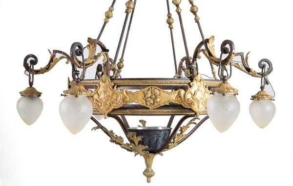 Lampadario sei luci in ferro e ottone con bocce in vetro opalino molato. XX secolo.