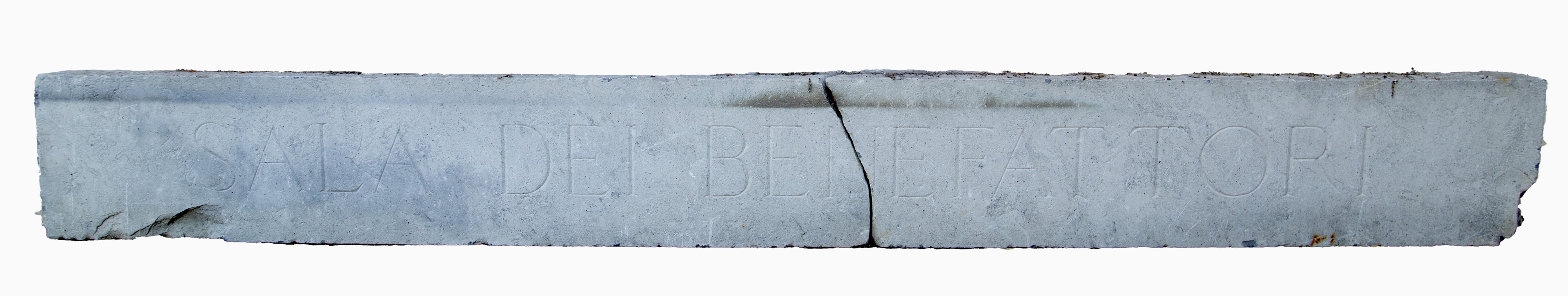 Lastra in marmo con scritta 'Sala dei benefattori'. Difetti e rotture.