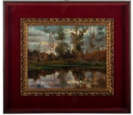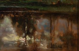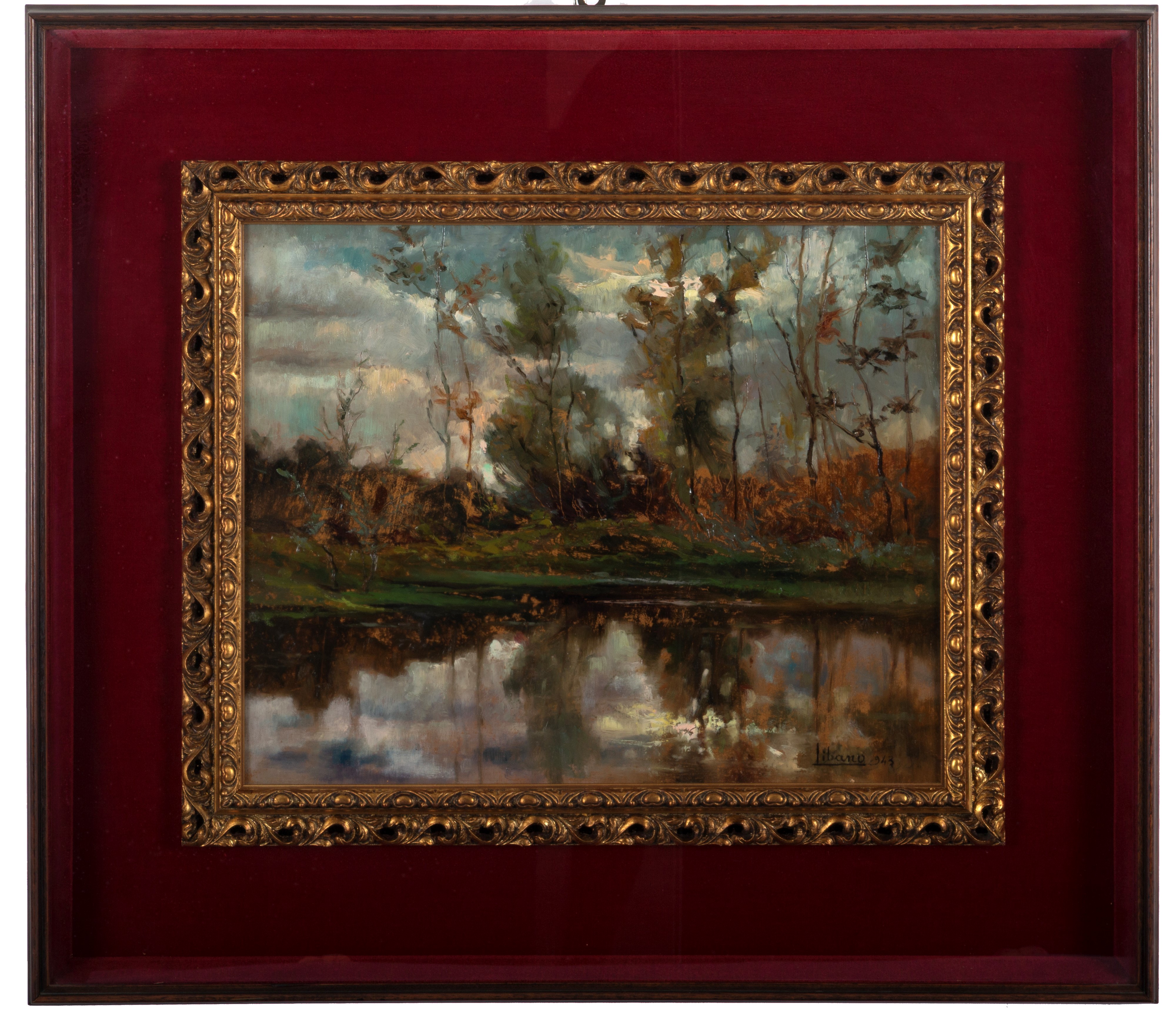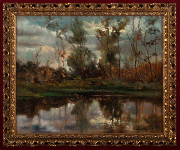 Dipinto olio su masonite intitolato “RIFLESSI NELL’ACQUA”. Firmato e datato 1943 in basso a destra. Controfirmato, intitolato e ridatato sul retro. In cornice.