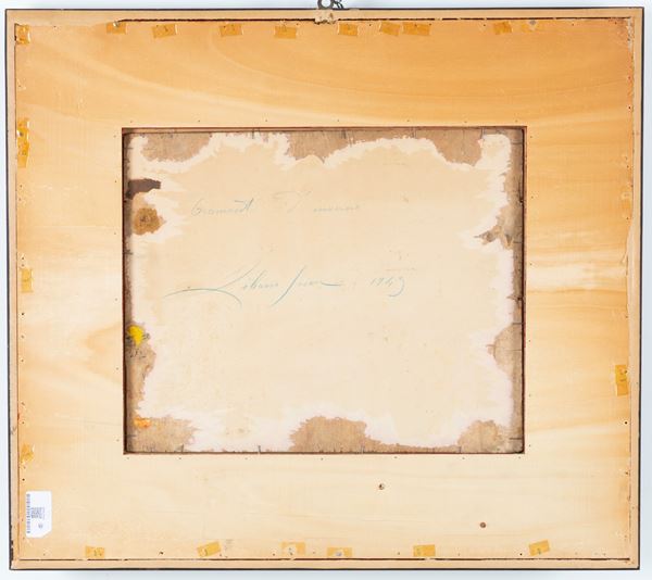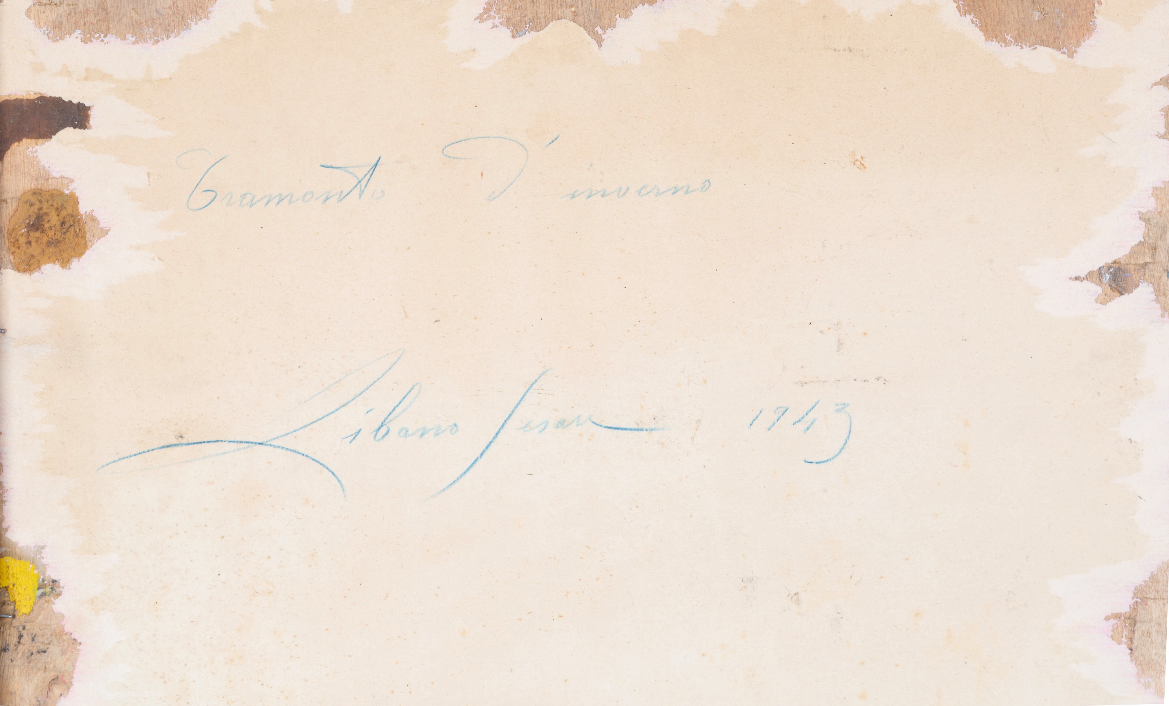 Dipinto olio su tavoletta intitolato “TRAMONTO D’INVERNO”. Firmato in basso a destra. Controfirmato, intitolato e datato 1943 sul retro. In cornice.