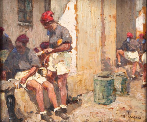Dipinto olio su tavoletta raffigurante "PESCATORI". Firmato in basso a destra. In cornice in legno.