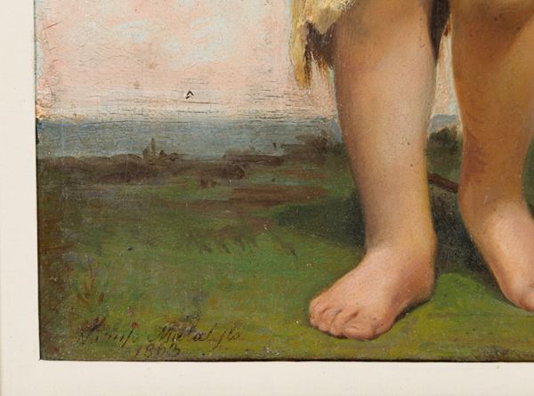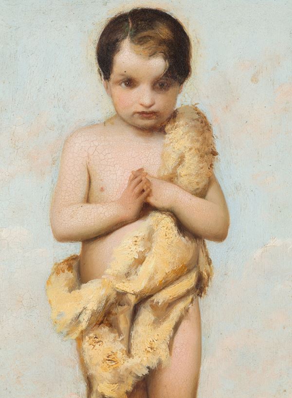 Dipinto olio su lamina di zinco raffigurante "SAN GIOVANNINO". Firmato e datato 1863 in basso a sinistra. In cornice dorata. Lievi restauri. Con autentica della Dott.ssa Graziella Martinelli Braglia.