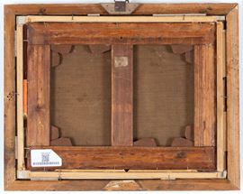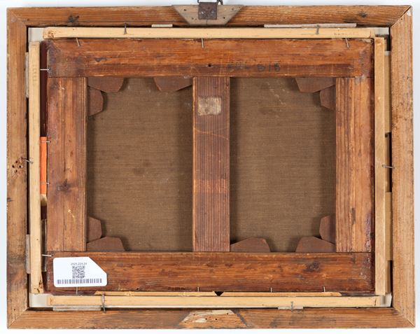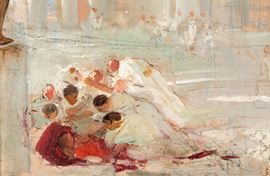 Bozzetto olio su tela raffigurante "PERSONAGGI IN PIAZZA". Firmato in basso a destra. In cornice in legno intagliato e dorato. Restauri.