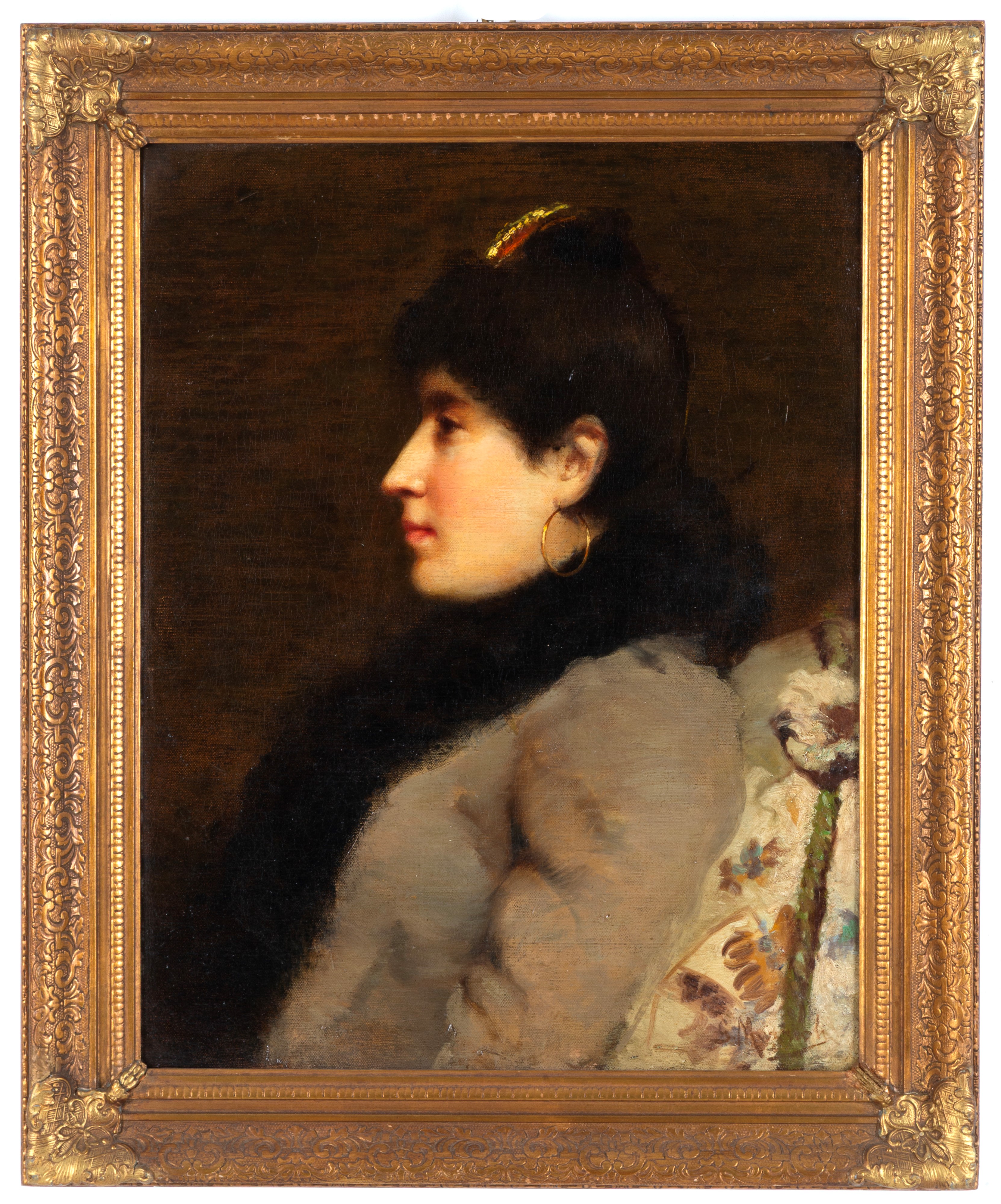 Dipinto olio su tela raffigurante "RITRATTO DI SIGNORA DI PROFILO". Firmato in basso a destra. In cornice in legno intagliato e dorato. Restauri. Pubblicato in G. Martinelli Bragaglia, P. Nicholls, L. Rivi (a cura di), Giovanni Muzzioli (1854-1894). Il vero, la storia e la finzione. Catalogo della mostra (Carpi, 27 novembre 2009-24 gennaio 2010), Allemandi & C., Torino, 2010, p. 122.