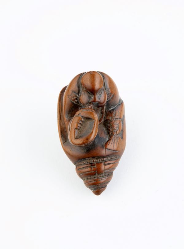 Netsuke in legno raffigurante "DIVINITA' CHE ESCE DA UNA CONCHIGLIA". Giappone.