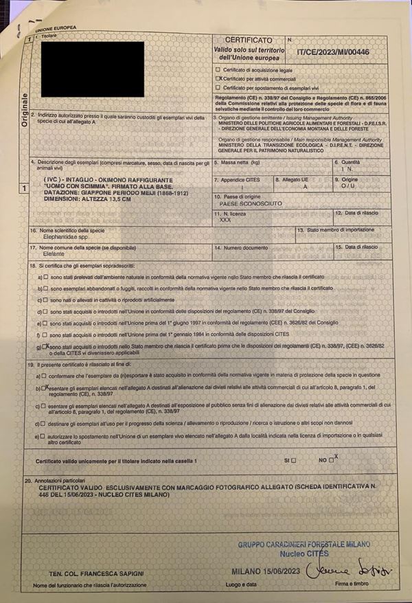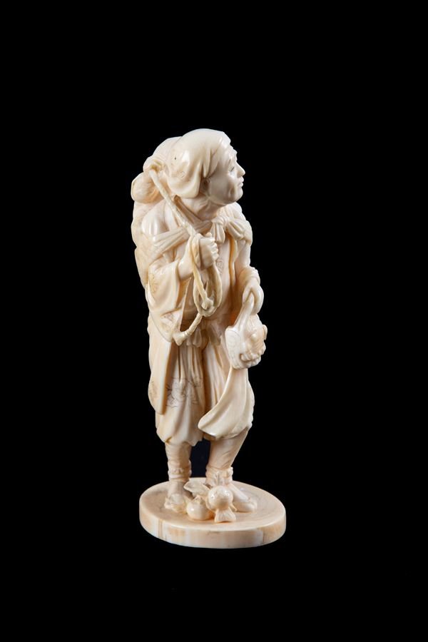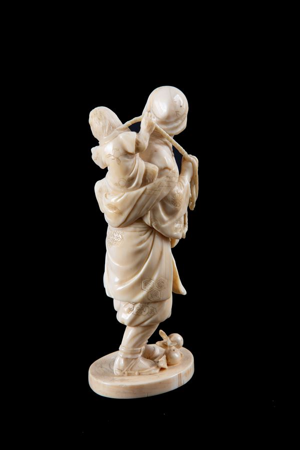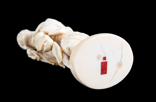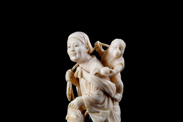 Okimono in avorio raffigurante "UOMO CON SCIMMIA". Firmato alla base. Giappone. Periodo Meiji. Con certificato CITES.