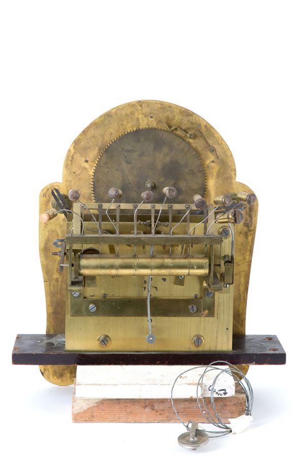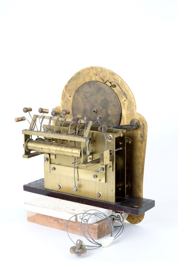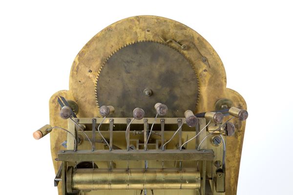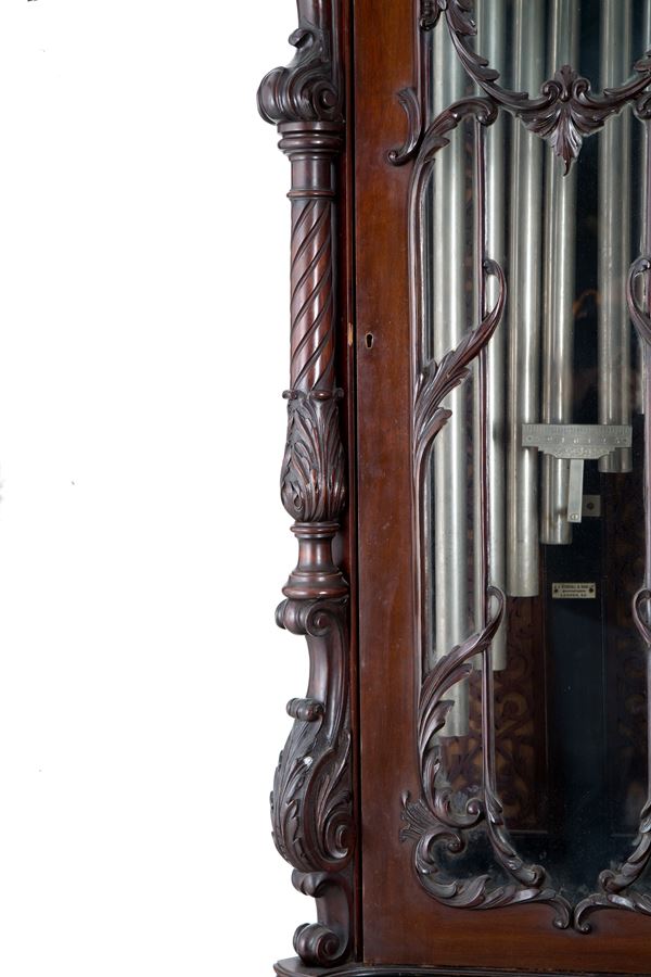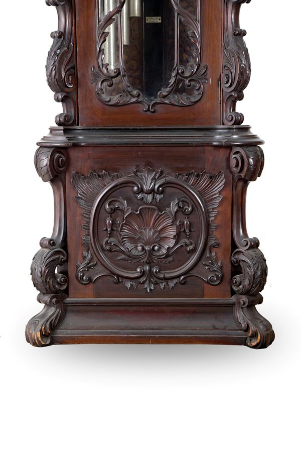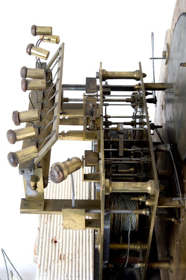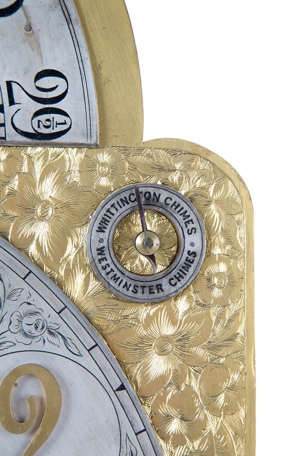 Orologio a torre in legno di mogano intagliato con suoneria a canne e quadrante in ottone cesellato e smaltato. Meccanismo complicato con ore, mezzi, quarti e fasi lunari. Periodo Georgiano. Difetti.