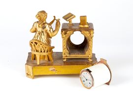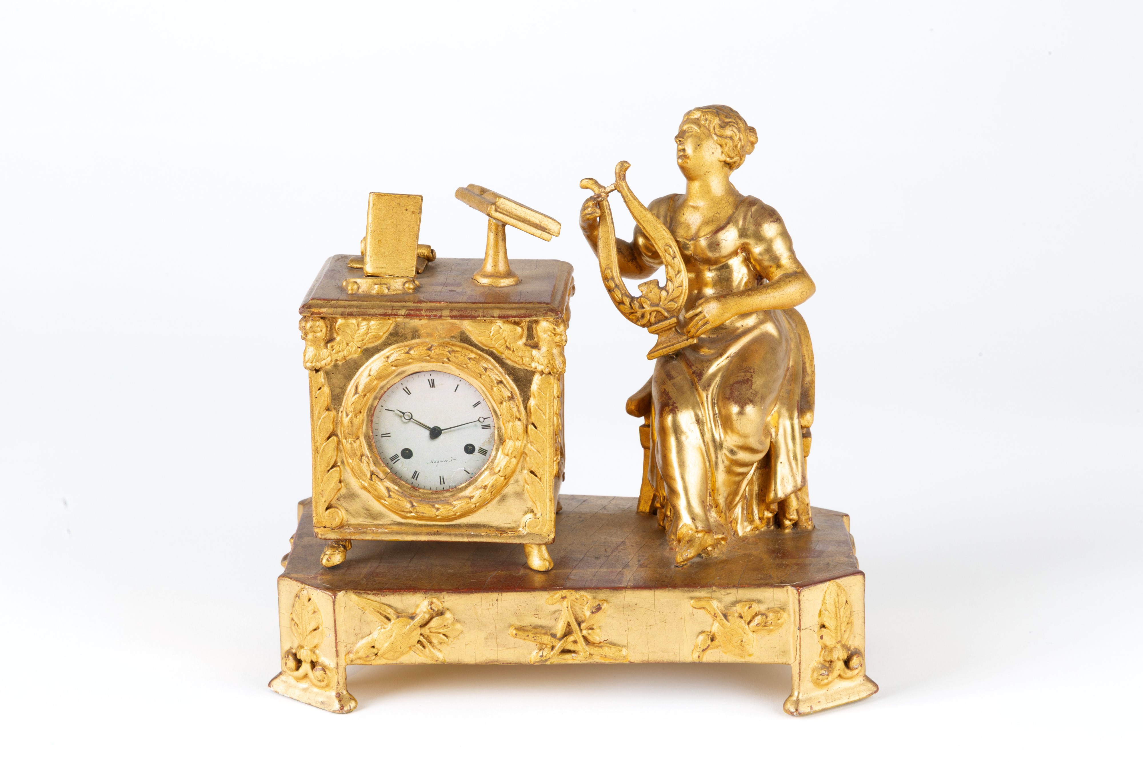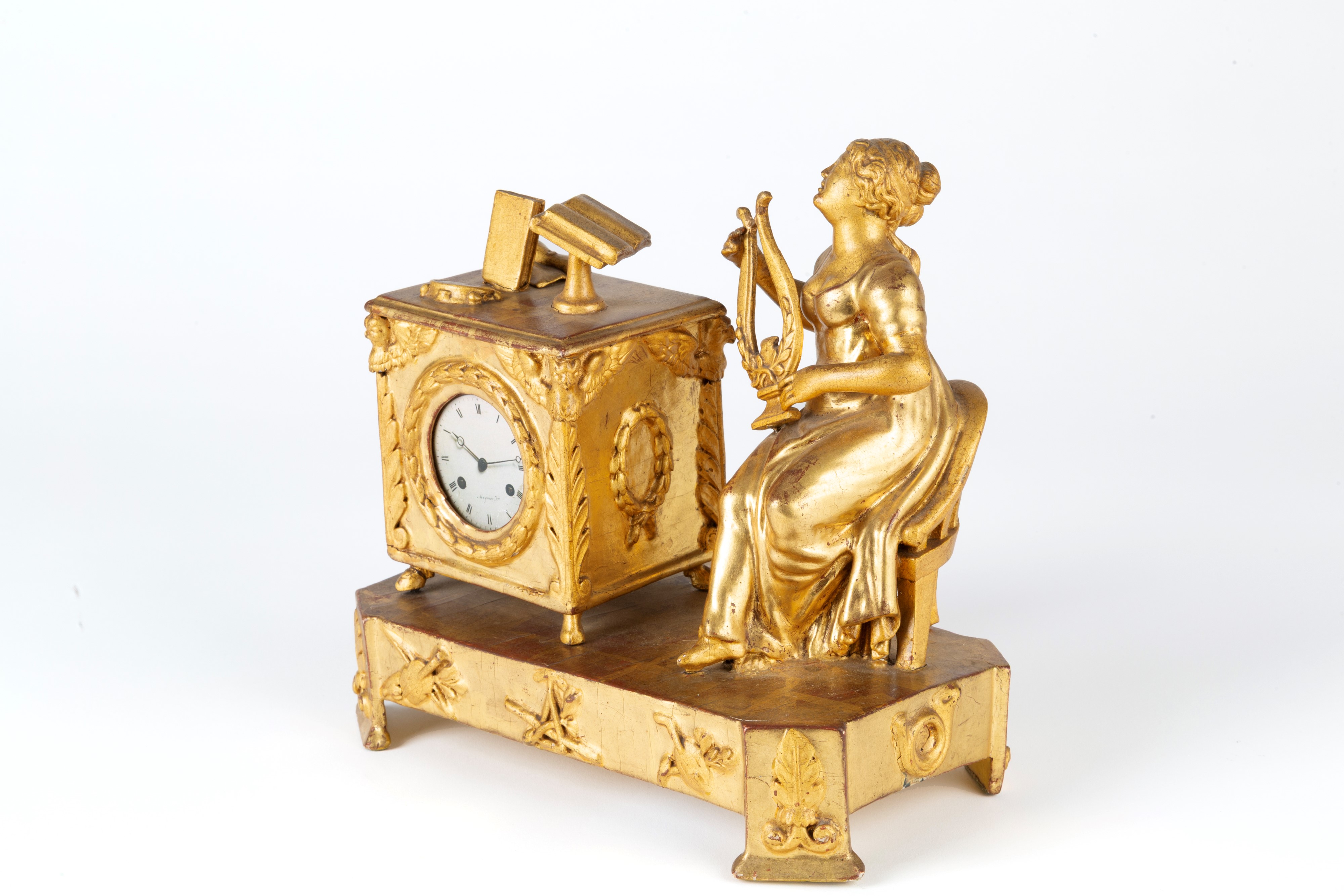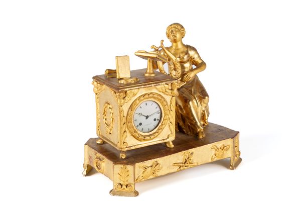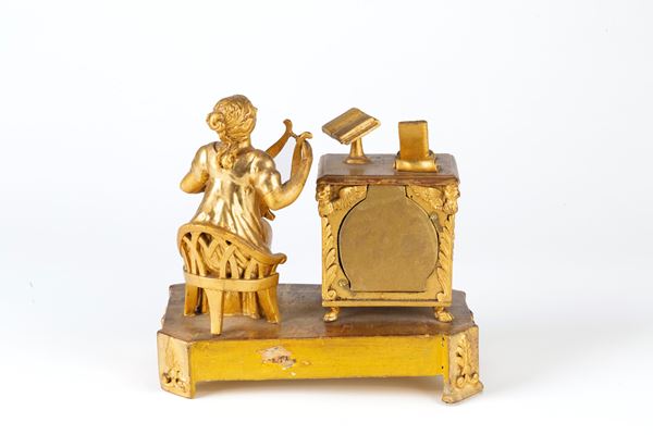 Orologio da tavolo in legno finemente intagliato e dorato con suonatrice di cetra. Inizi XIX secolo. Mancante di meccanismo.