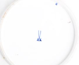 Piatto in porcellana di Meissen fondo blu con decori dorati a rilevo. Marcato sul fondo. Fine XIX secolo.