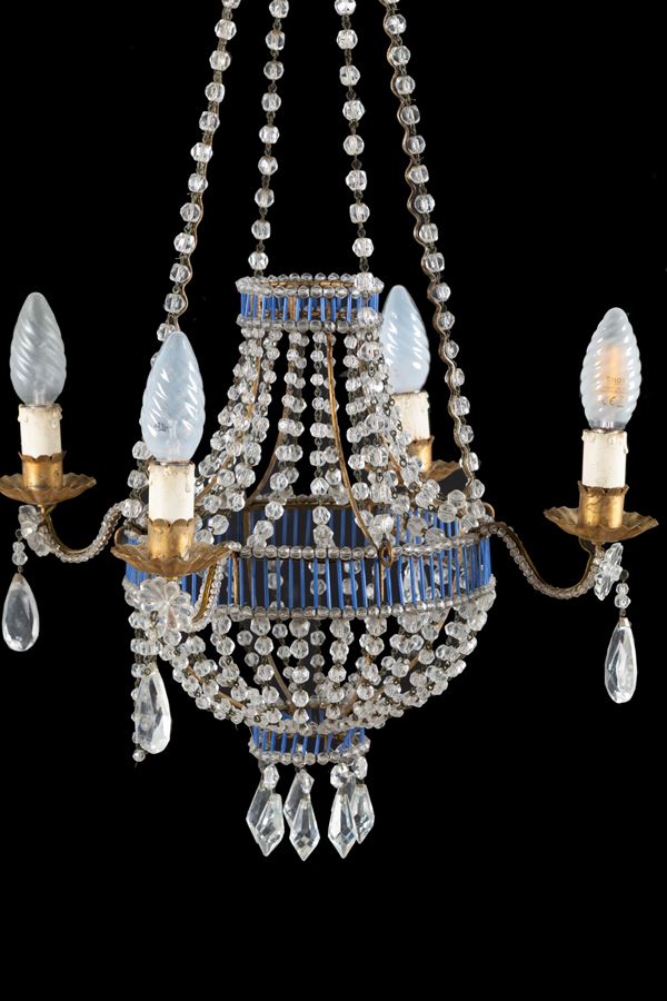 Piccolo lampadario a mongolfiera quattro luci con perline e lamierino dorato. Fine XIX secolo. Mancanze.