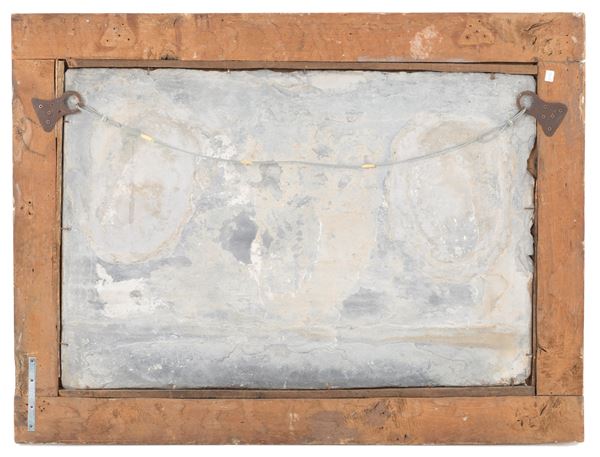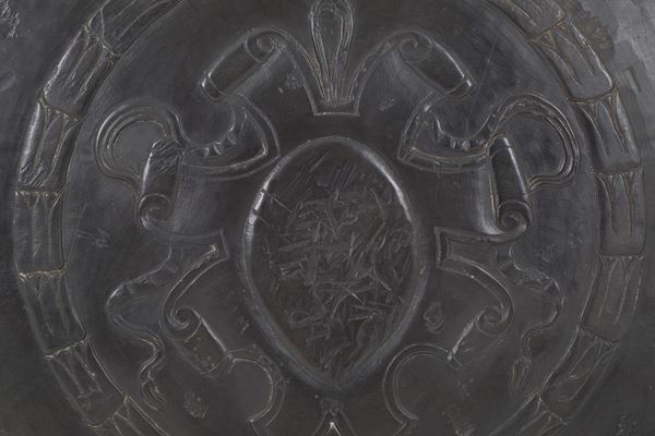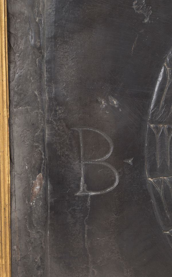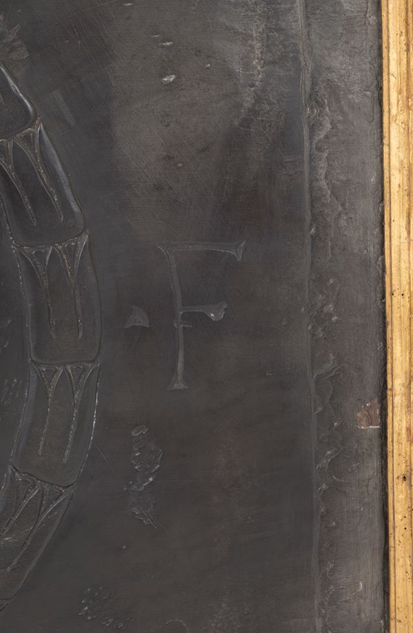 Placca in ardesia scolpita con stemma centrale e iniziali ai lati. XIX secolo. In cornice in legno dorato. Difetti.