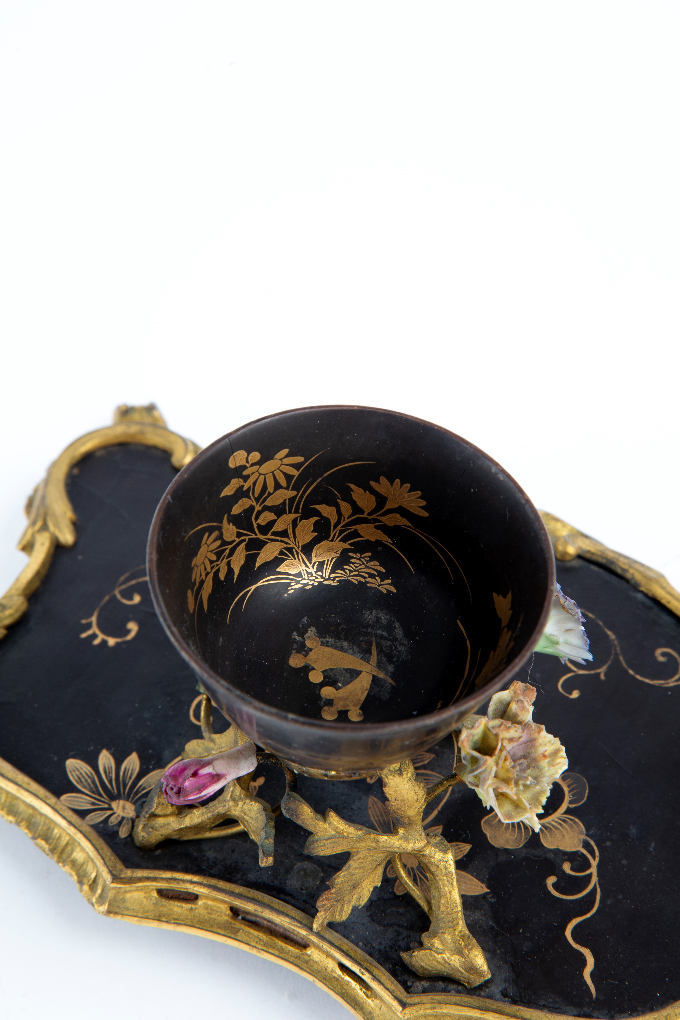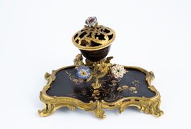 Porta profumo in bronzo finemente cesellato e dorato, legno laccato nero e fiori in porcellana. Francia. XVIII secolo.