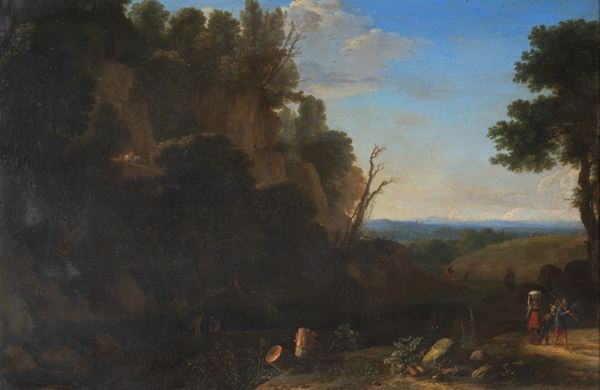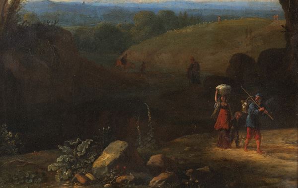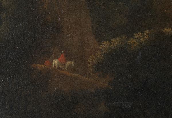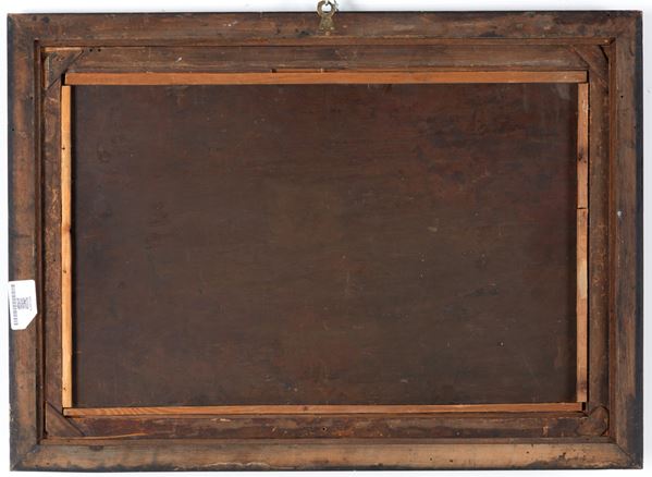 Dipinto su rame raffigurante "PAESAGGIO ANIMATO". In cornice. Difetti e restauri.