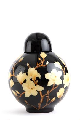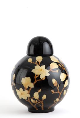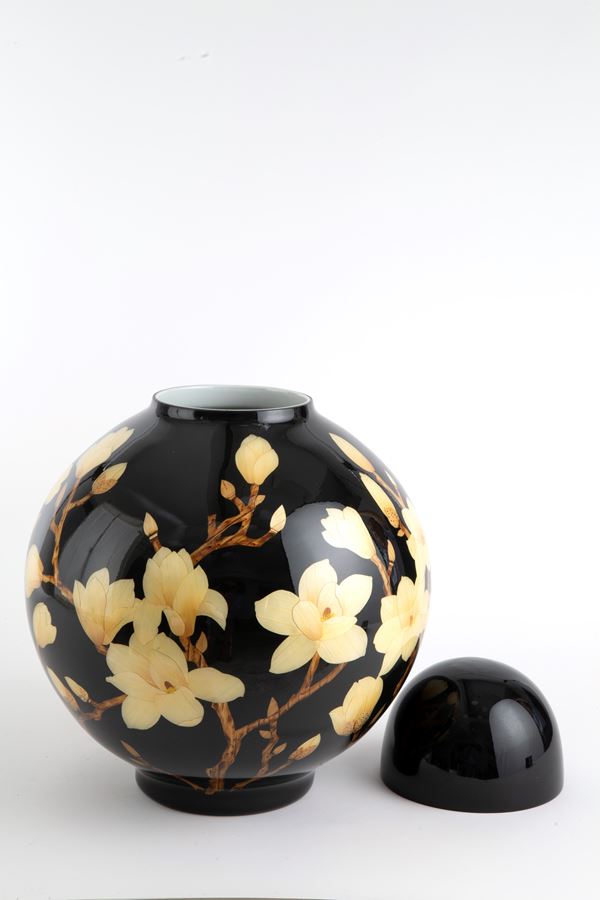 Potiche in porcellana a fondo nero decorata con magnolie. XIX secolo.