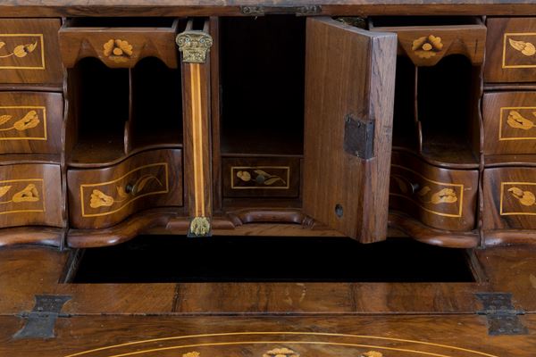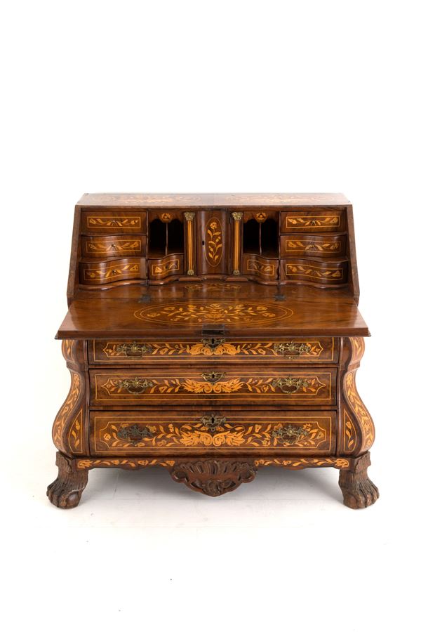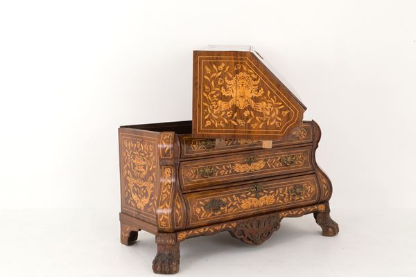 Ribalta in legno finemente intarsiato sagomata sul fronte. Olanda. XVII secolo.
