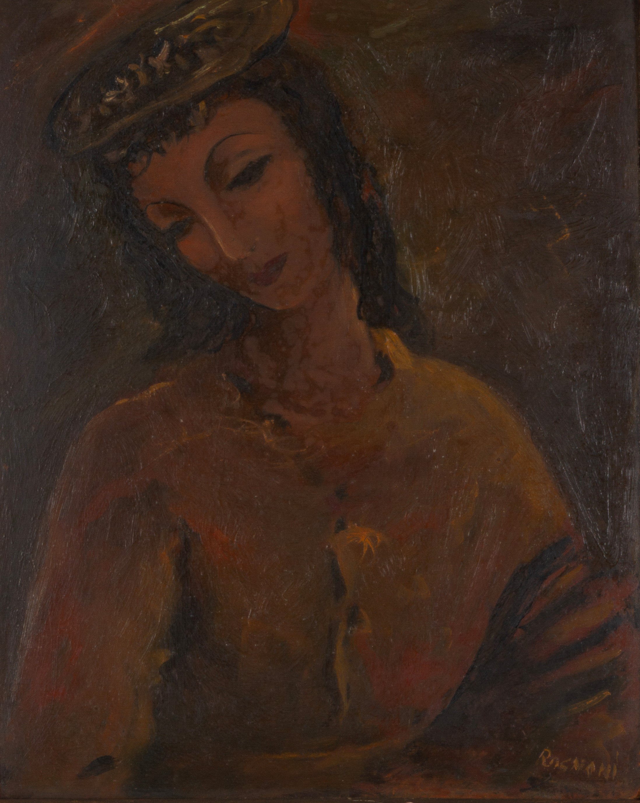 Dipinto olio su masonite raffigurante "RITRATTO DI DONNA". Firmato in basso a destra. In cornice in legno dorato.