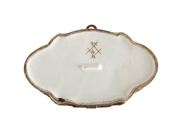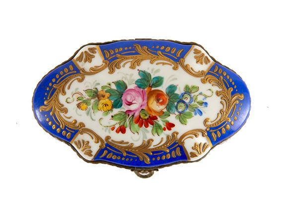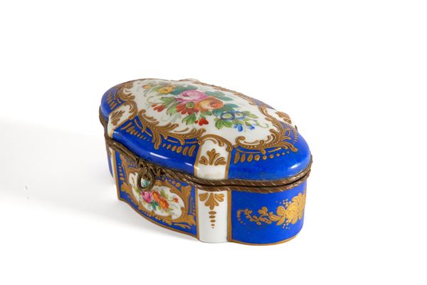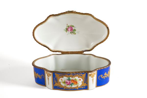Scatola polilobata in porcellana a fondo blu con motivi floreali con guarnizioni in bronzo dorato. Marcata JD DUMONT LIMOGES sul fondo. Fine XIX secolo.