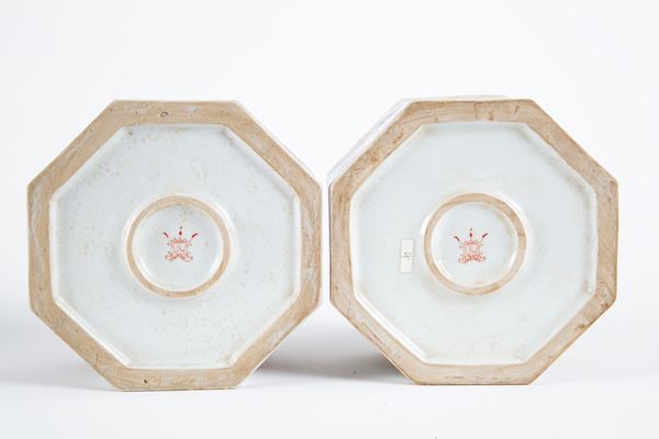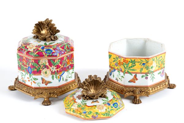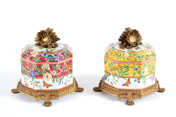 Scatole ottagonali con coperchio in porcellana decorata a motivi floreali e guarnizioni in bronzo dorato a forma di conchiglia. Basi in bronzo dorato finemente cesellato. Marcate JUWC sul fondo.