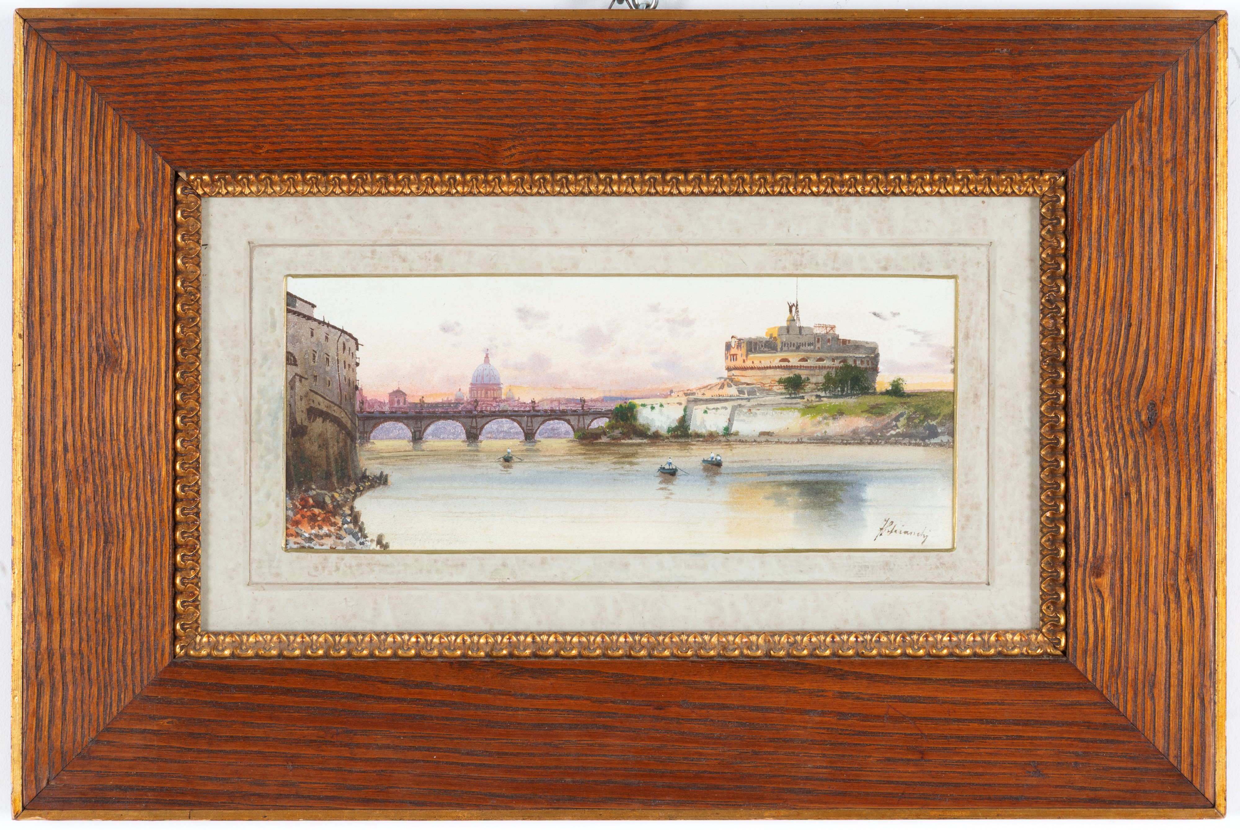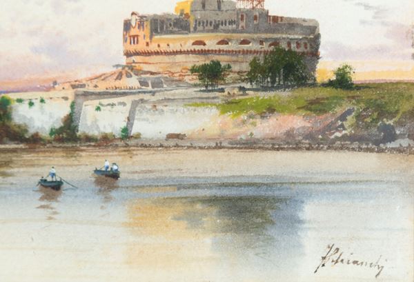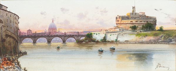 Acquarello su cartoncino raffigurante "PONTE E CASTEL SANT'ANGELO CON LA CUPOLA DI SAN PIETRO". Firmato in basso a destra. In cornice.
