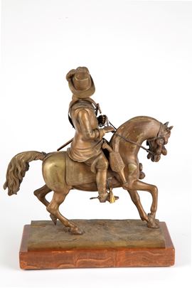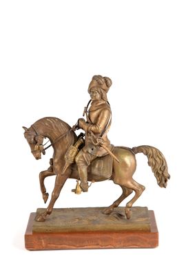 Scultura in bronzo raffigurante "CAVALIERE". XIX secolo. Base in marmo rosso. Difetti e mancanze.