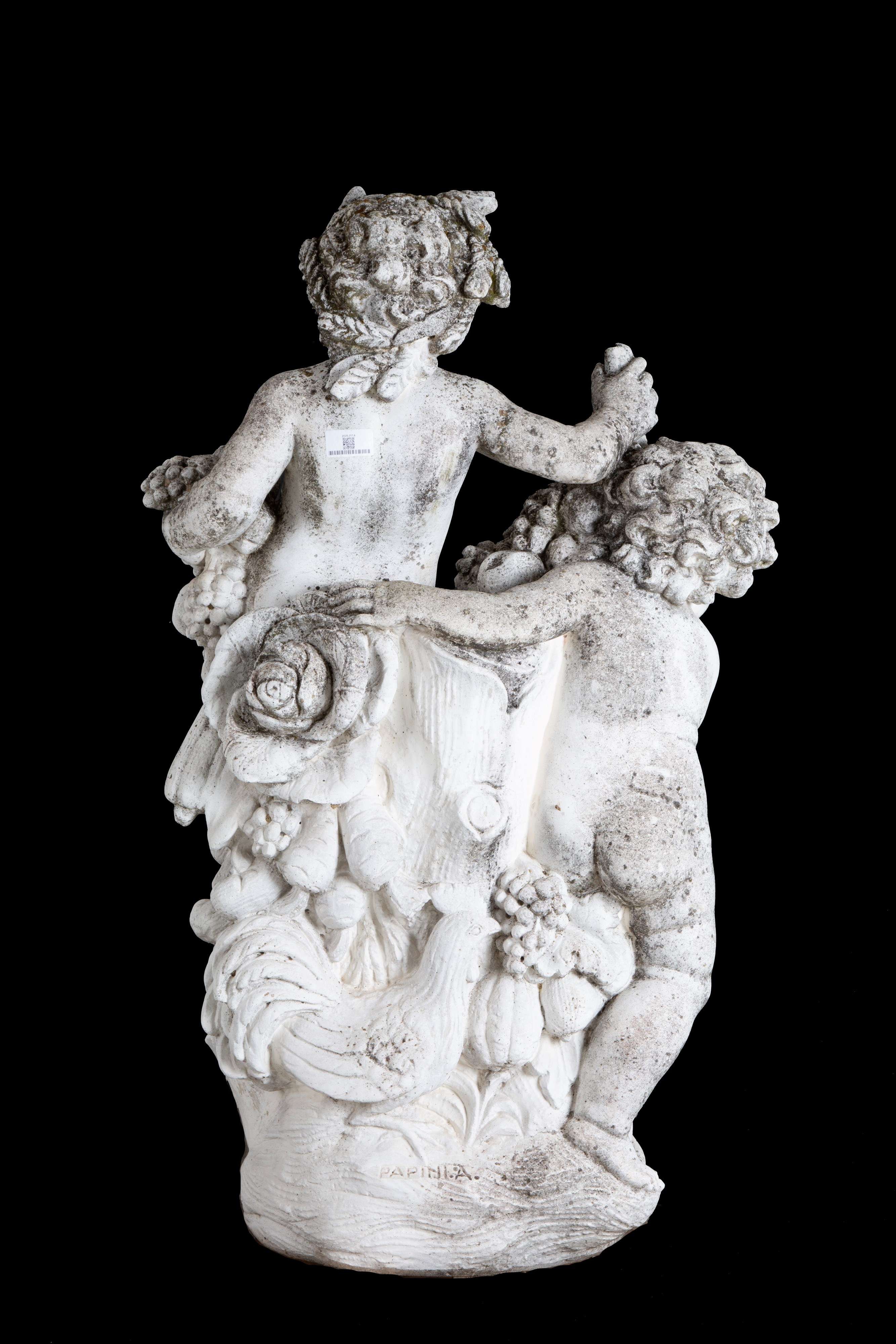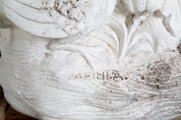 Scultura in agglomerato di pietra raffigurante "COPPIA DI PUTTI CON GRAPPOLI". Firmata PAPINI A sulla base.