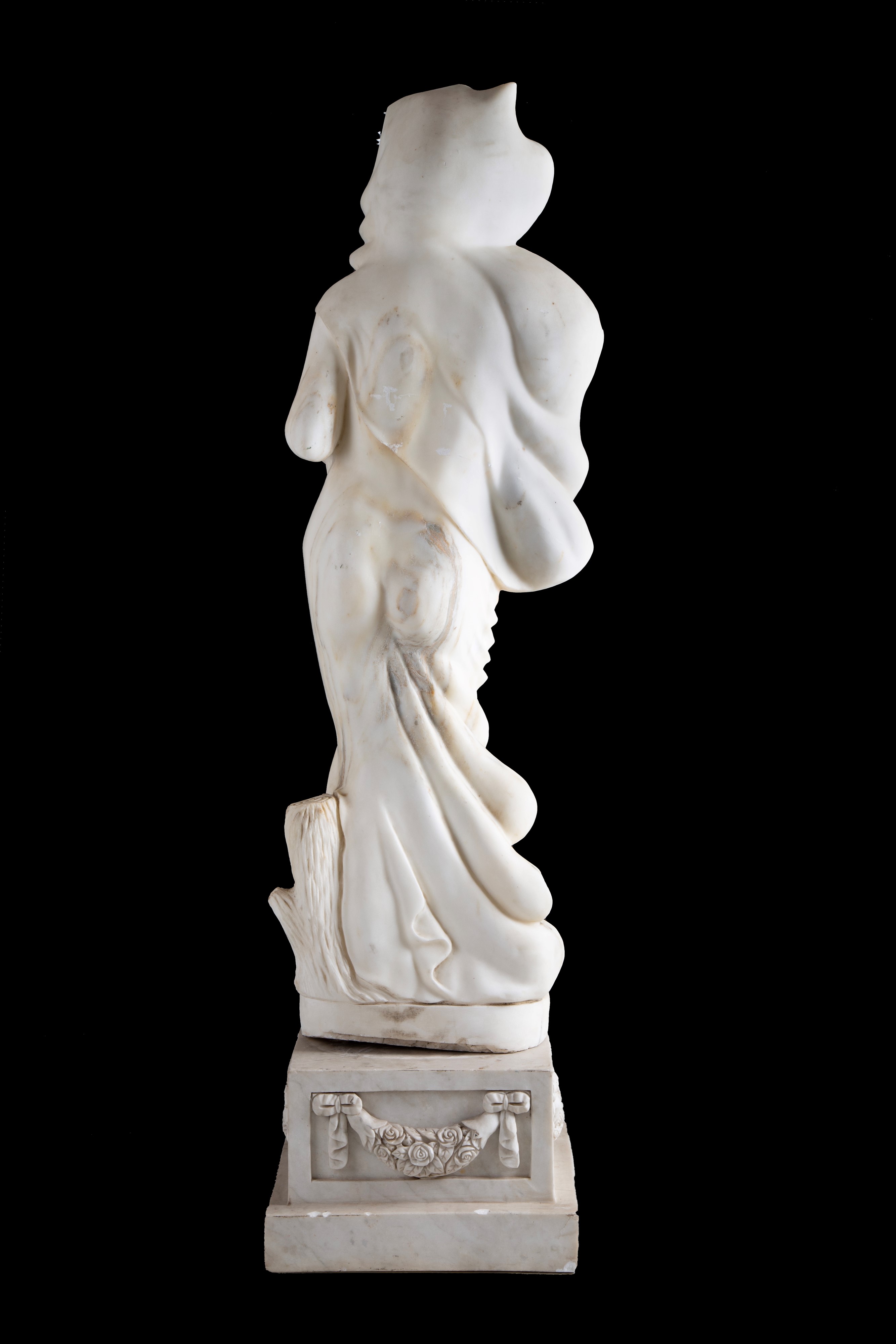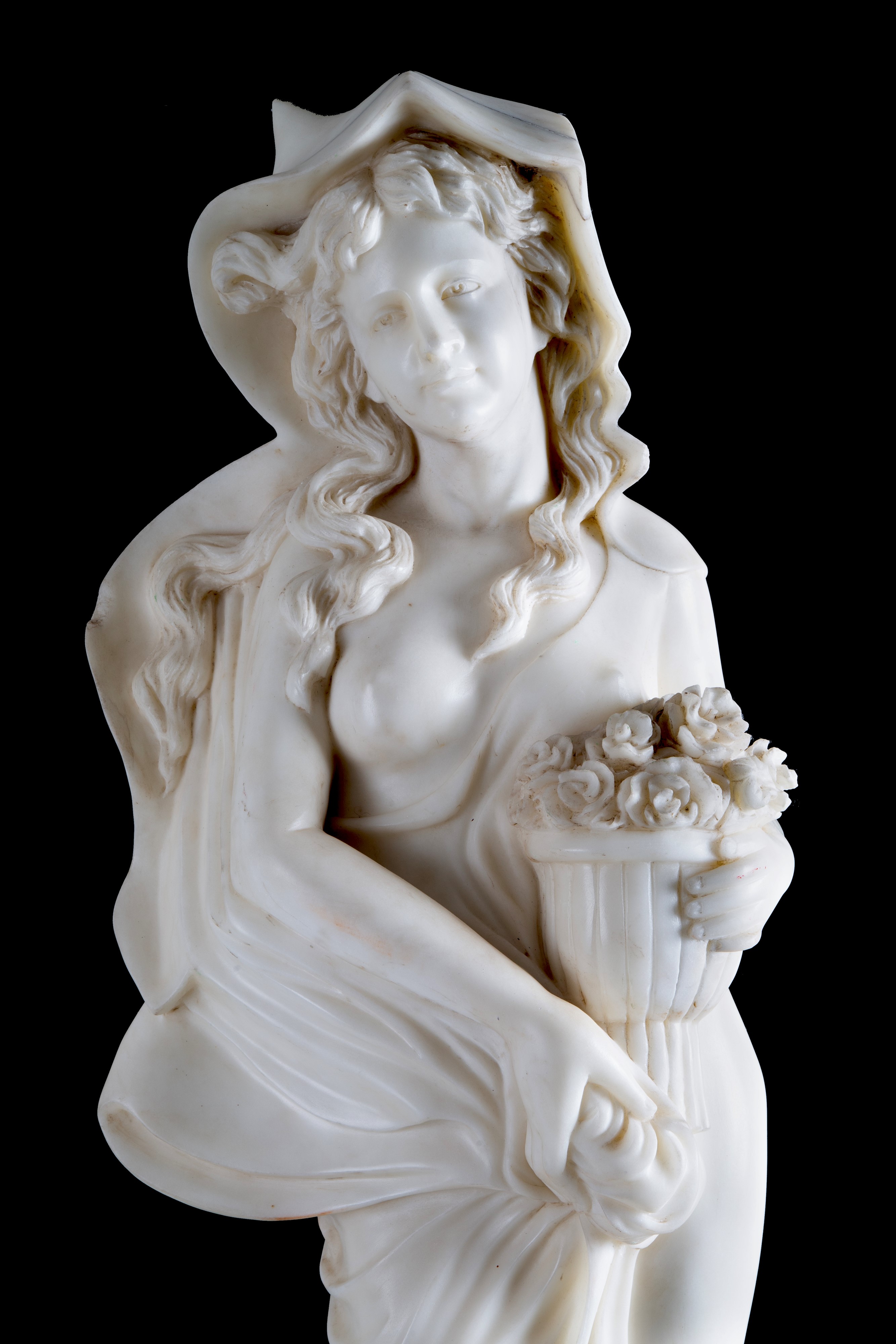 Scultura in marmo bianco di Carrara raffigurante "FIGURA FEMMINILE VELATA CON CESTA DI FIORI". XX secolo. Lievi difetti.
