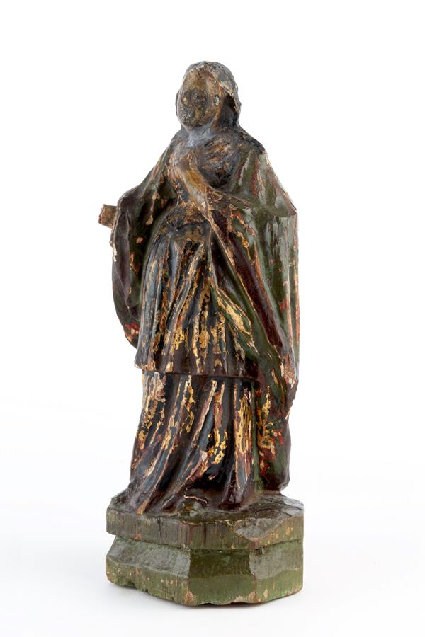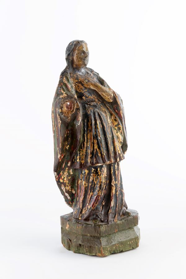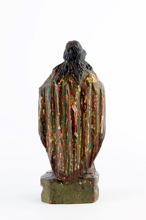 Scultura in legno intagliato policromo con lumeggiature dorate raffigurante "MADONNA". XVIII secolo. Difetti e mancanze.
