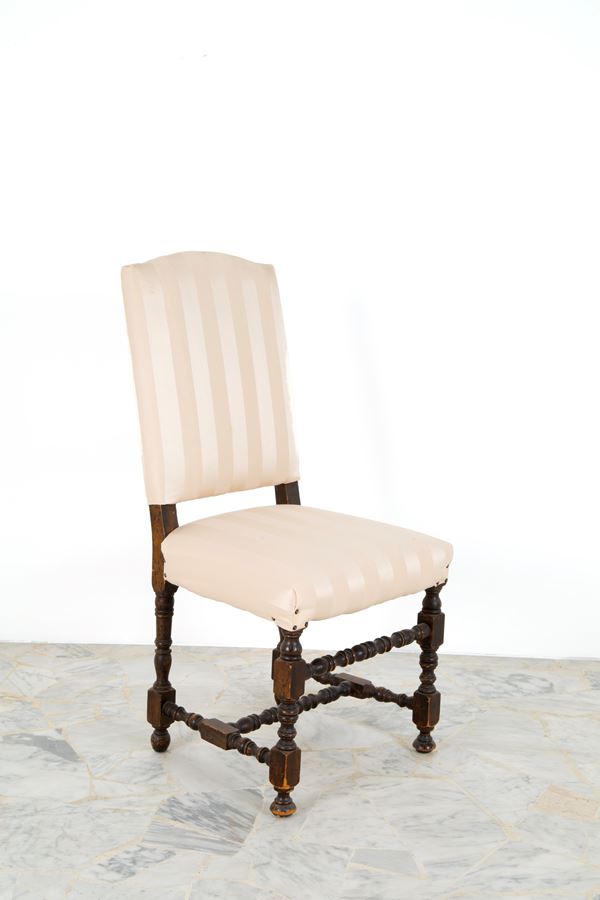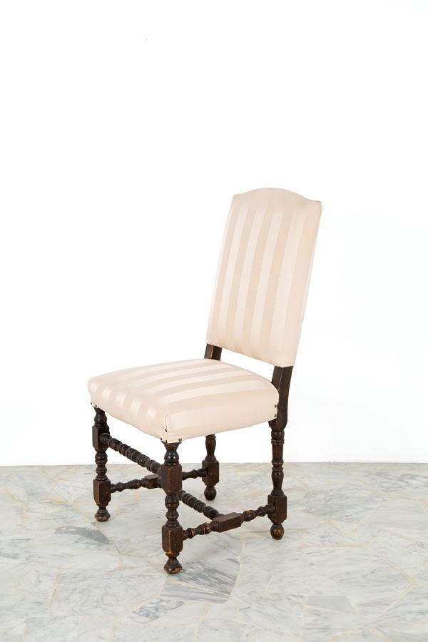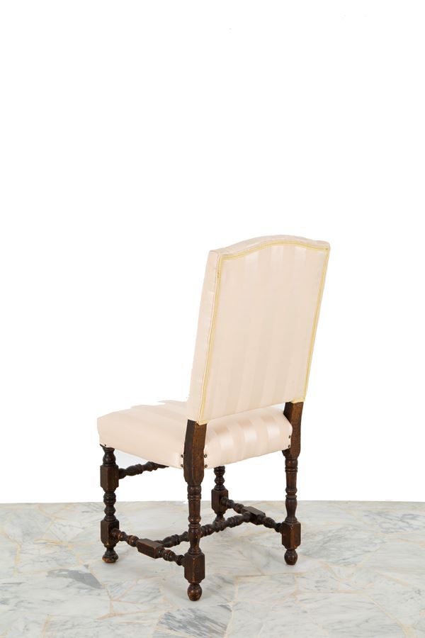 Sei sedie a rocchetto con schienale e sedili imbottiti. In stile. Difetti.