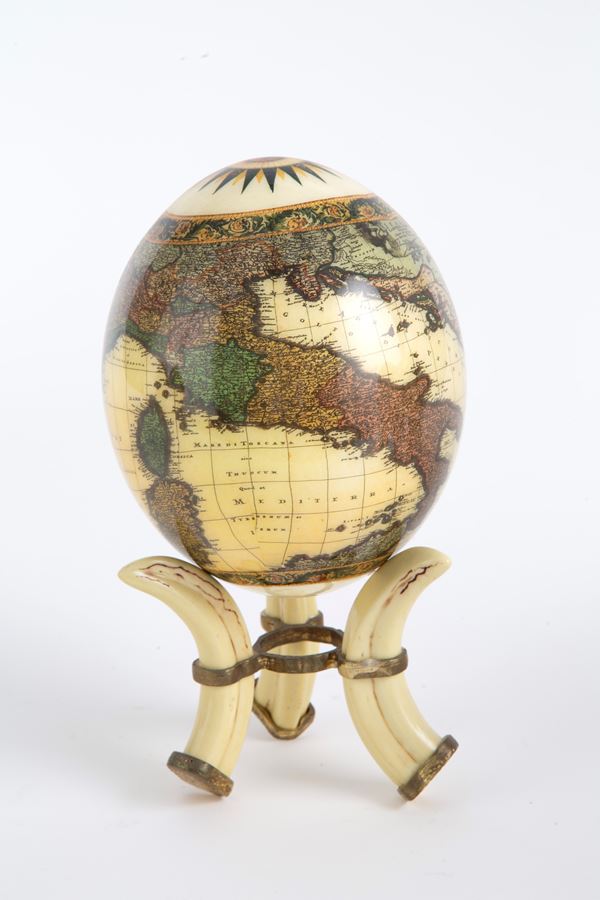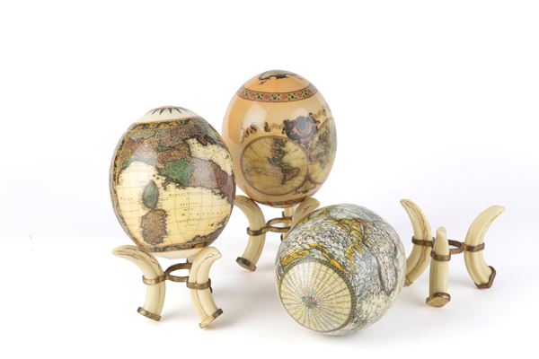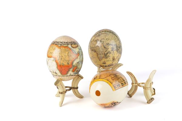 Sei uova di struzzo raffiguranti "EMISFERI". Basi in osso e bronzo dorato. XX secolo.