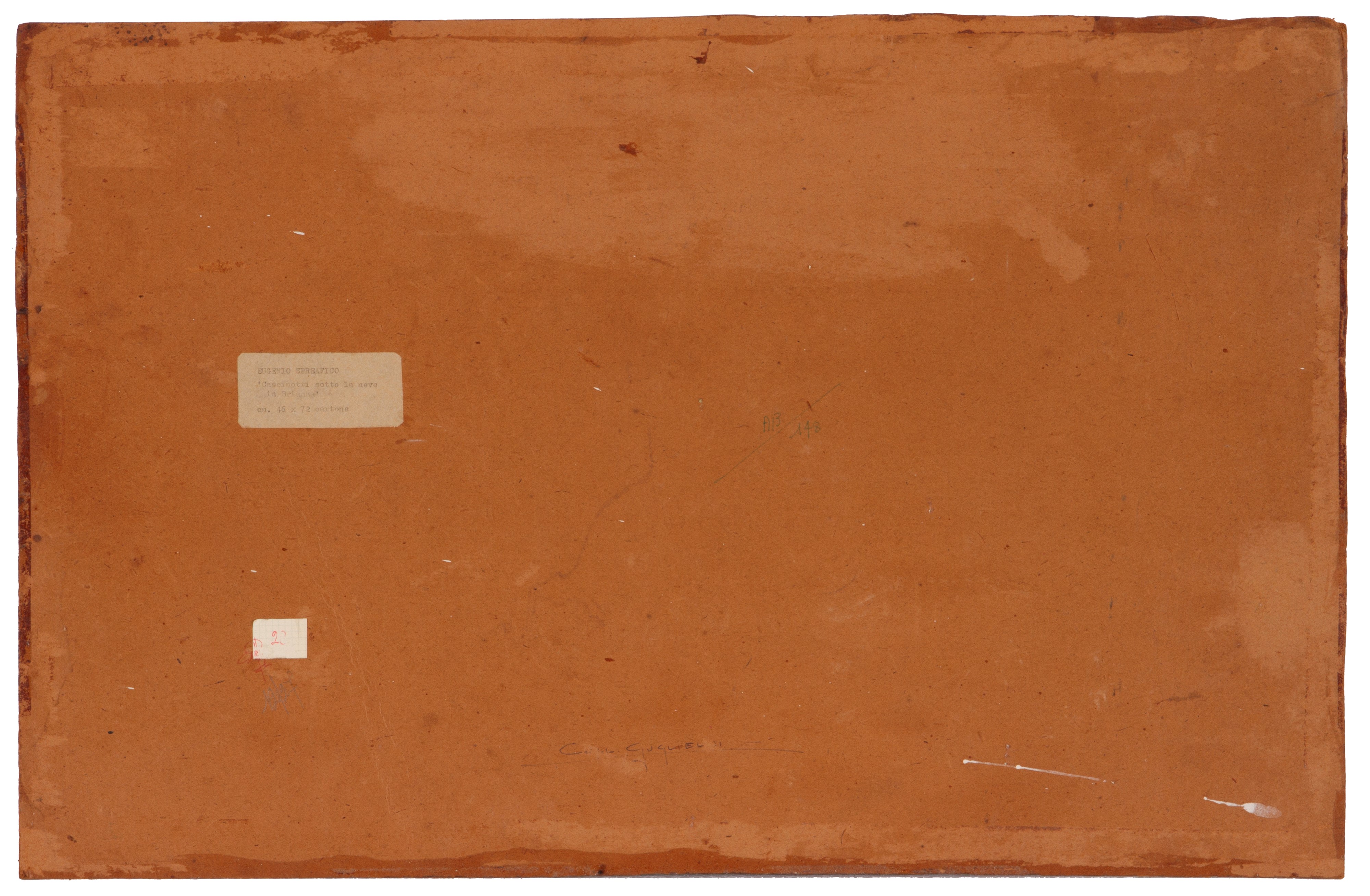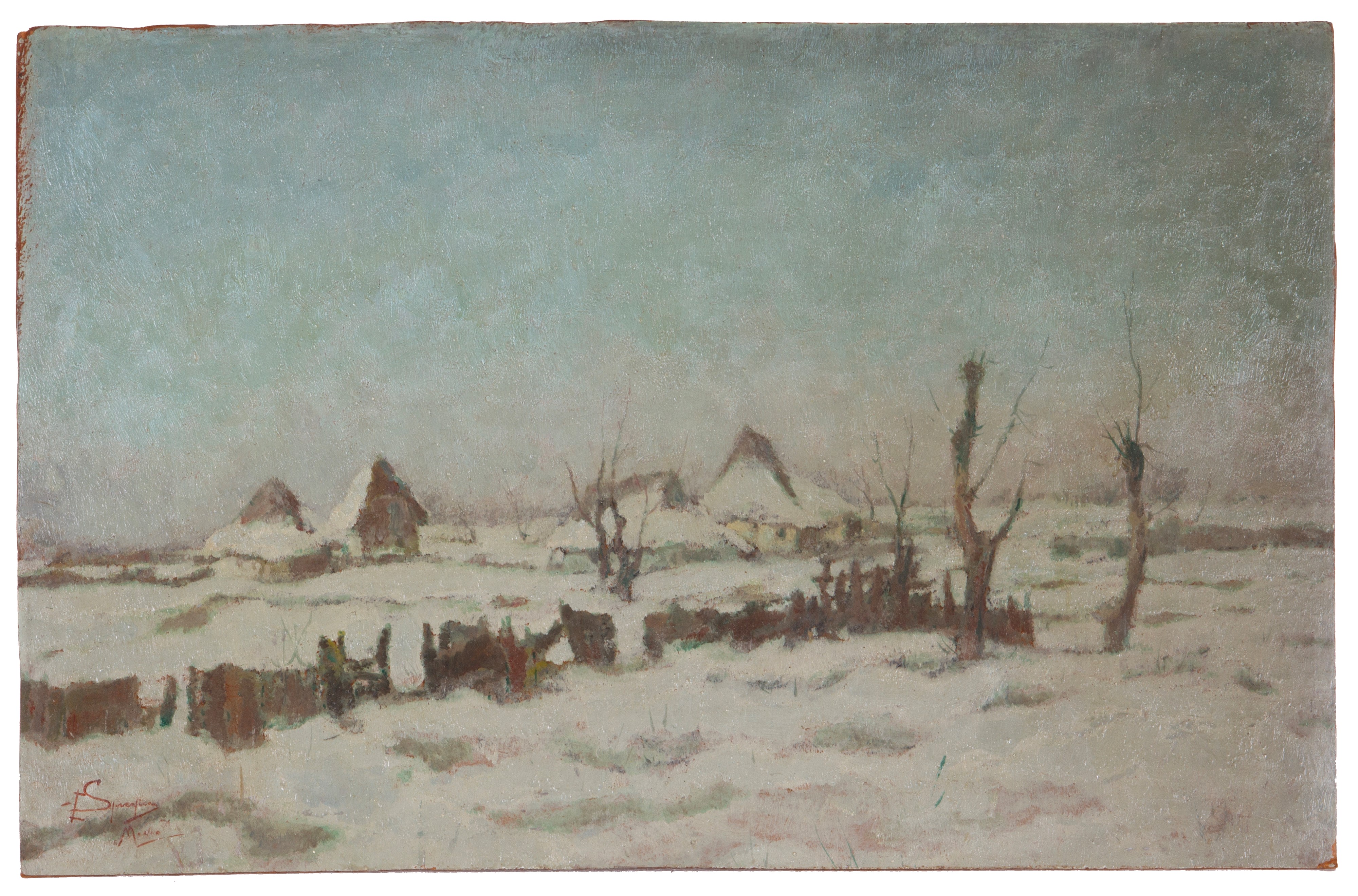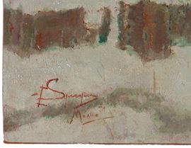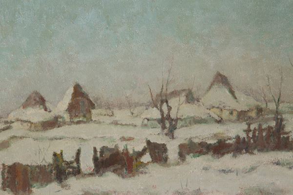 Dipinto olio su cartone raffigurante "CASCINOTTI SOTTO LA NEVE IN BRIANZA". Firmato in basso a sinistra. Restauri.