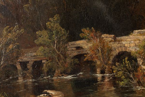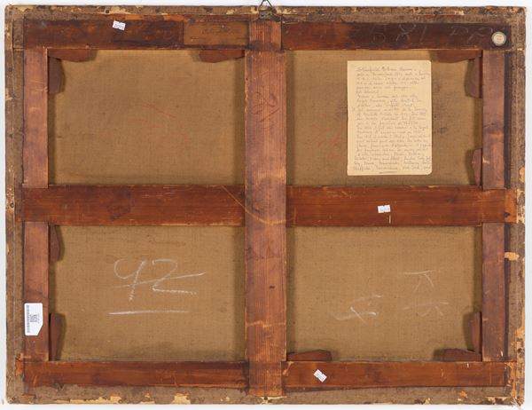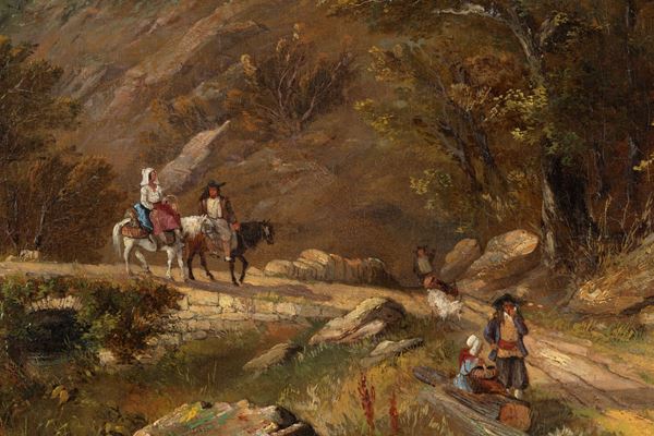 Dipinto olio su tela "PAESAGGIO CON VIANDANTI". Lievi restauri. Già rintelato.