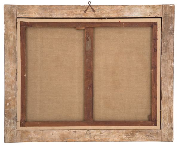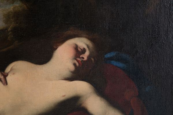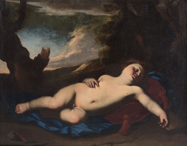 Dipinto olio su tela raffigurante "AMORINO DORMIENTE". In cornice in legno intagliato e dorato. Già rintelato e rintelaiato. Restauri.