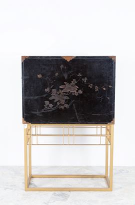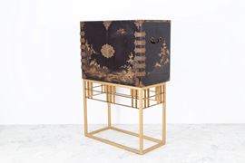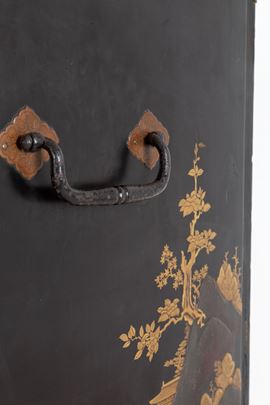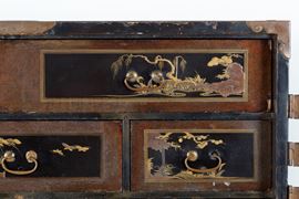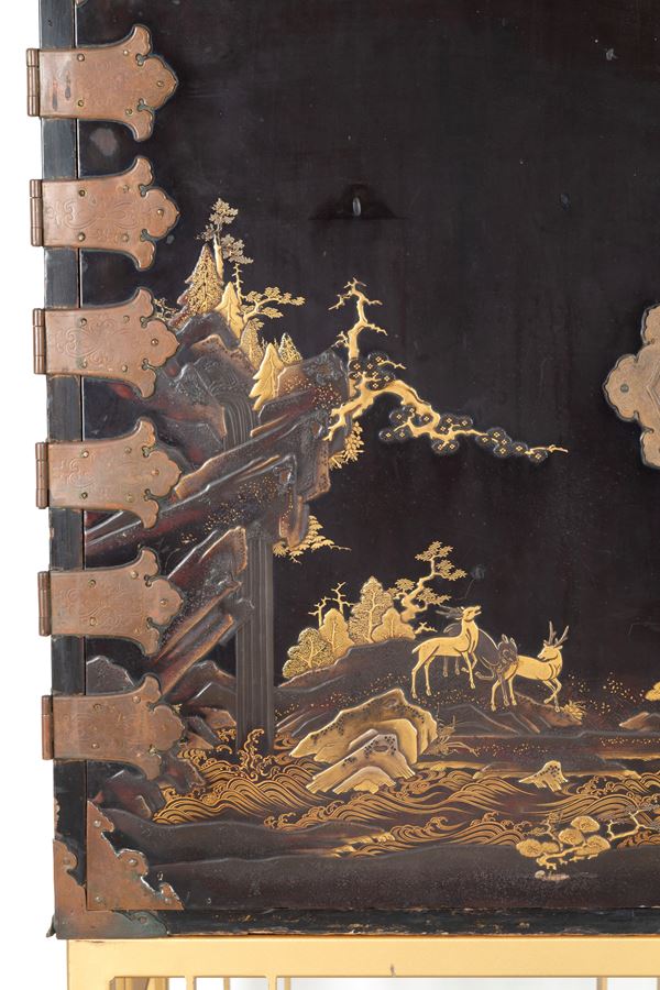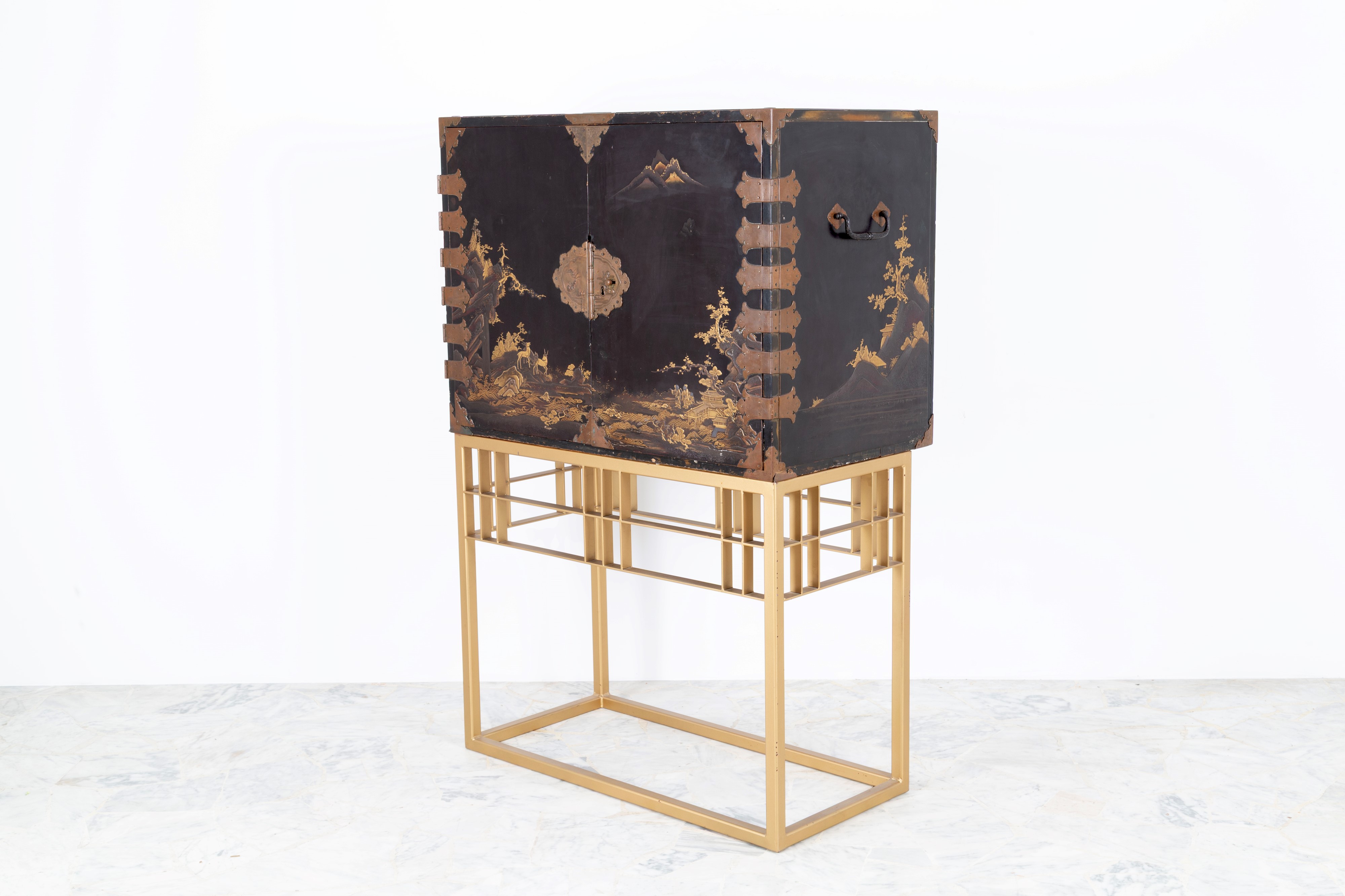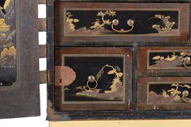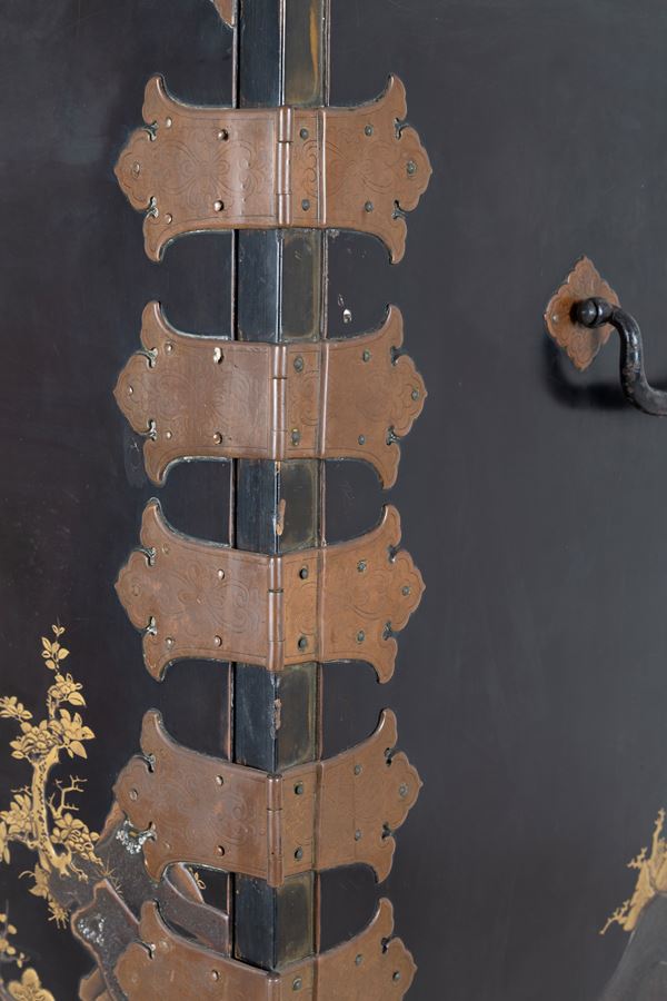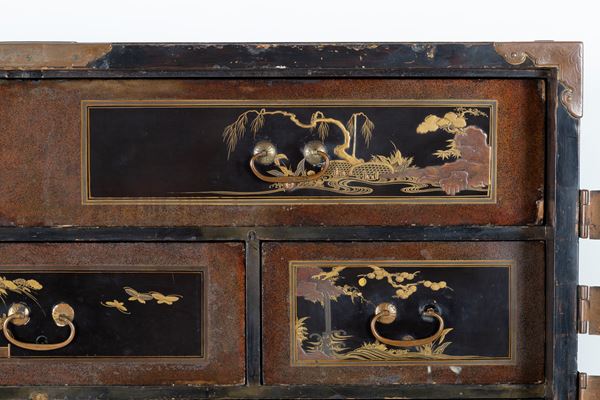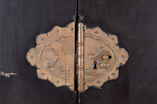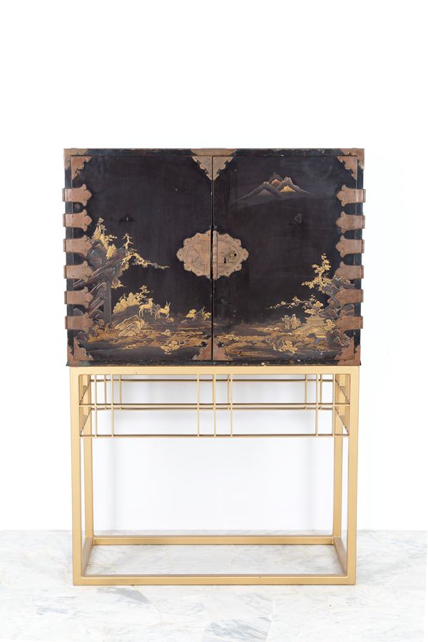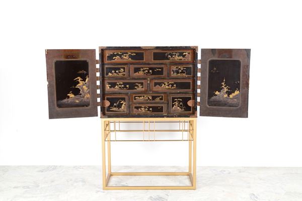 Stipo a due sportelli con undici cassetti all'interno in legno laccato nero e oro finemente dipinto con scene di vita orientale e con finiture in rame. Base in metallo non coeva. Giappone. Fine XVII secolo. Difetti.