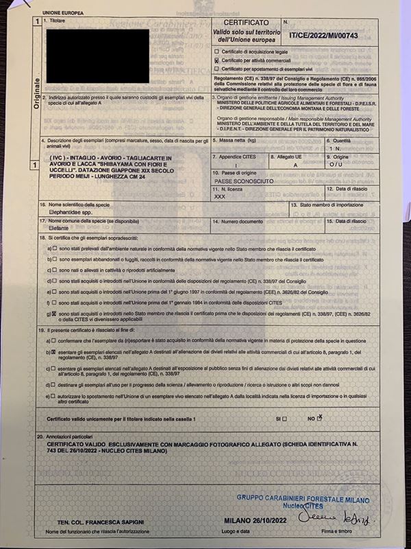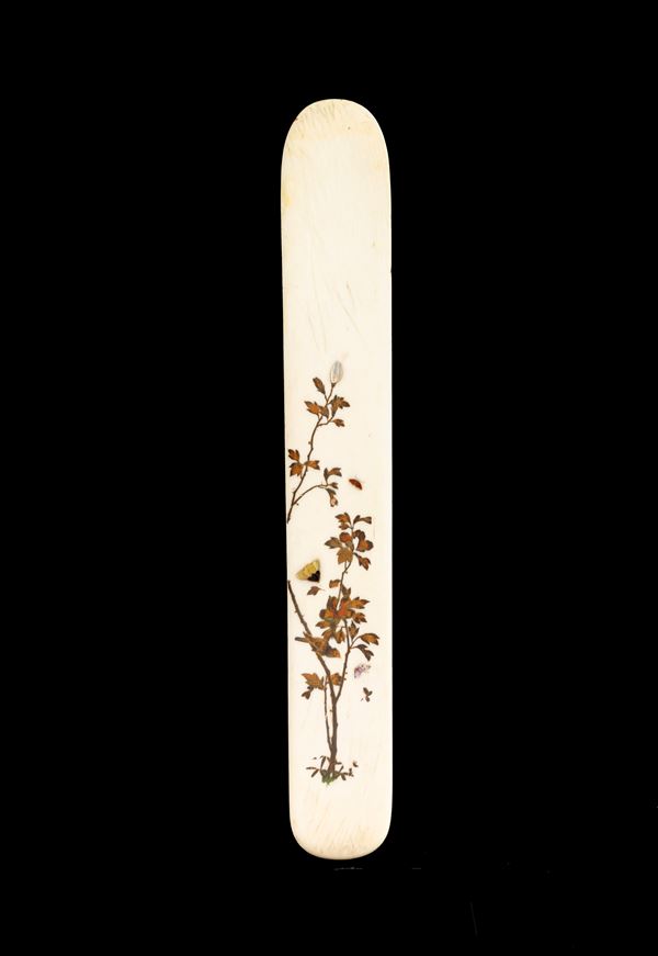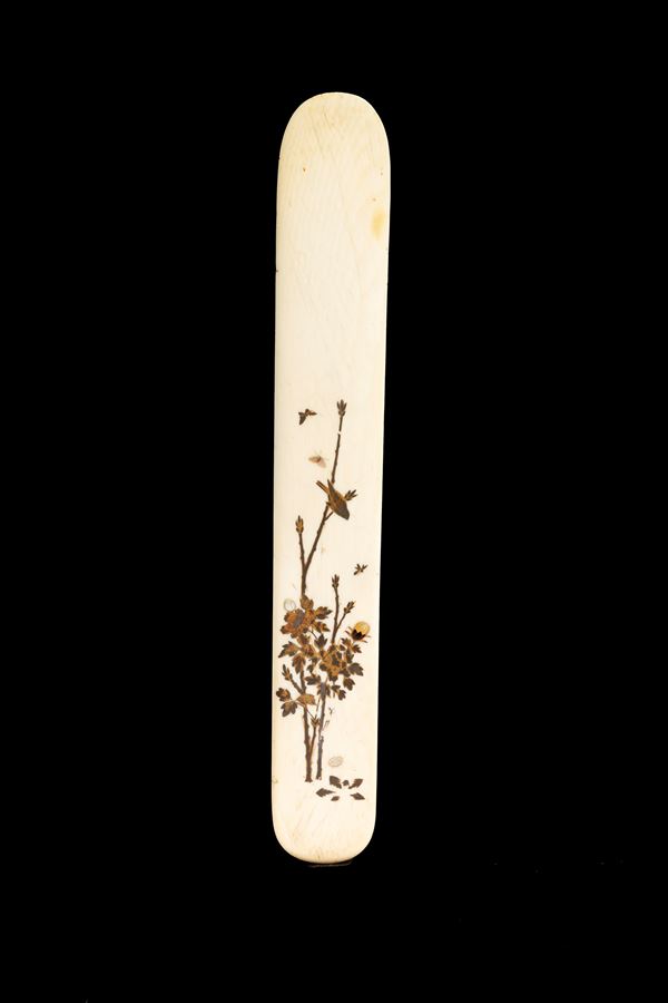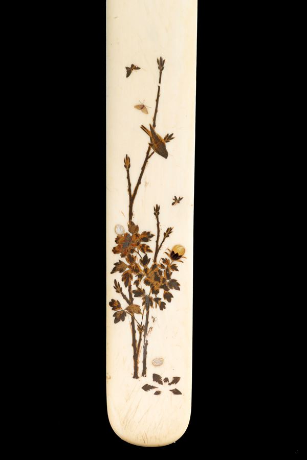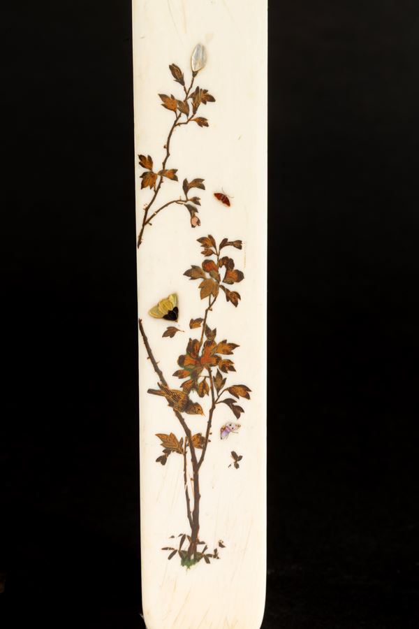 Tagliacarte shibayama in avorio e lacca con fiori e volatili. Giappone. Periodo Meiji. Con certificato CITES. Usure del tempo.