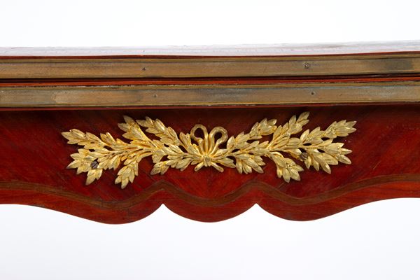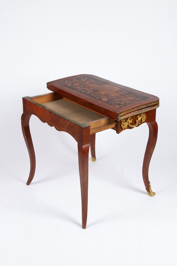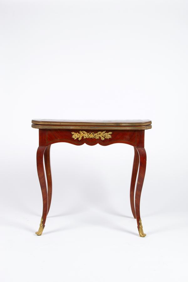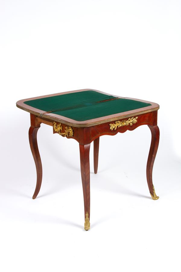 Tavolino da gioco in legno intarsiato con finiture in bronzo. Francia. Metà XIX secolo. Difetti.