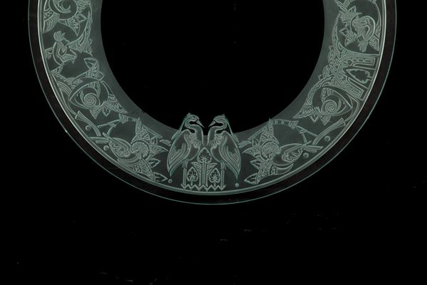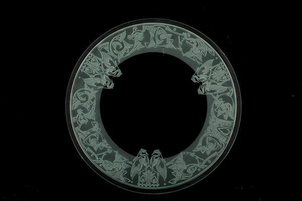 Tavolino rotondo in vetro molato e satinato a motivi floreali e volatili su base in ferro. XX secolo. Lievi difetti.