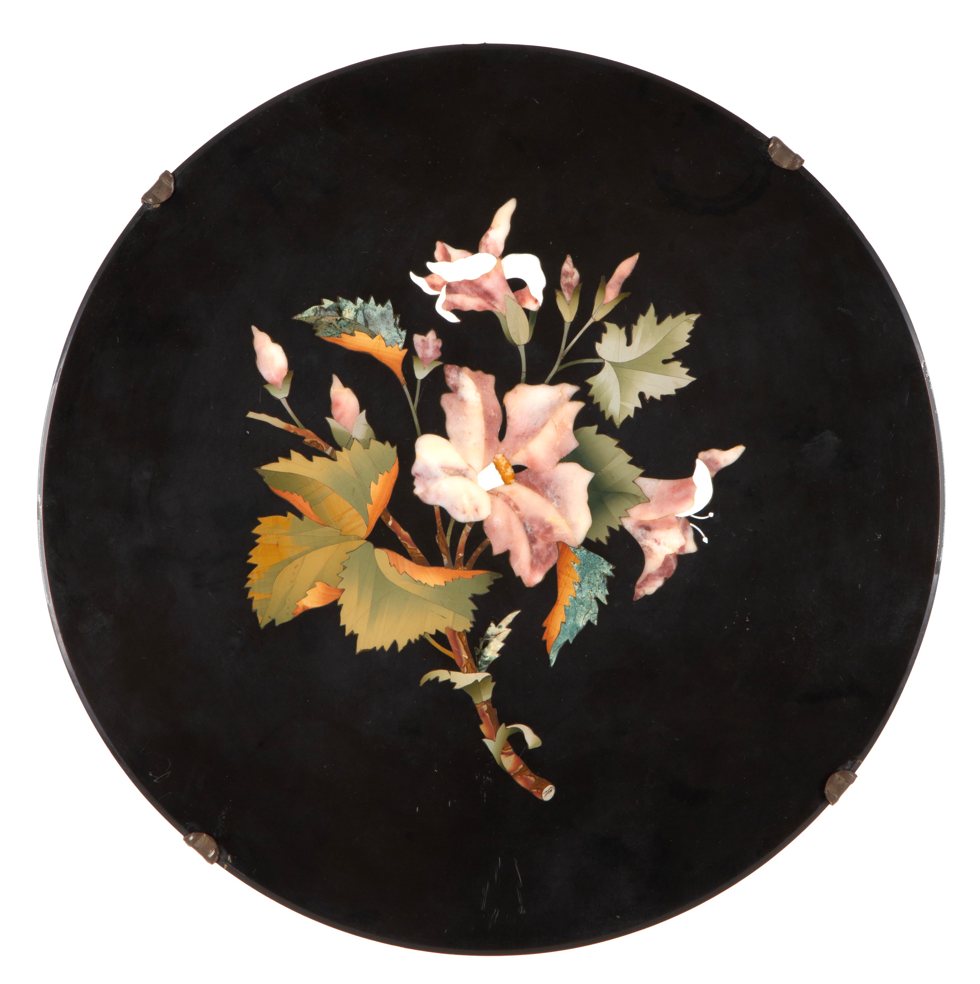 Tondo in marmo nero del Belgio intarsiato in marmi e pietre dure a motivi floreali. Firenze. XIX secolo.