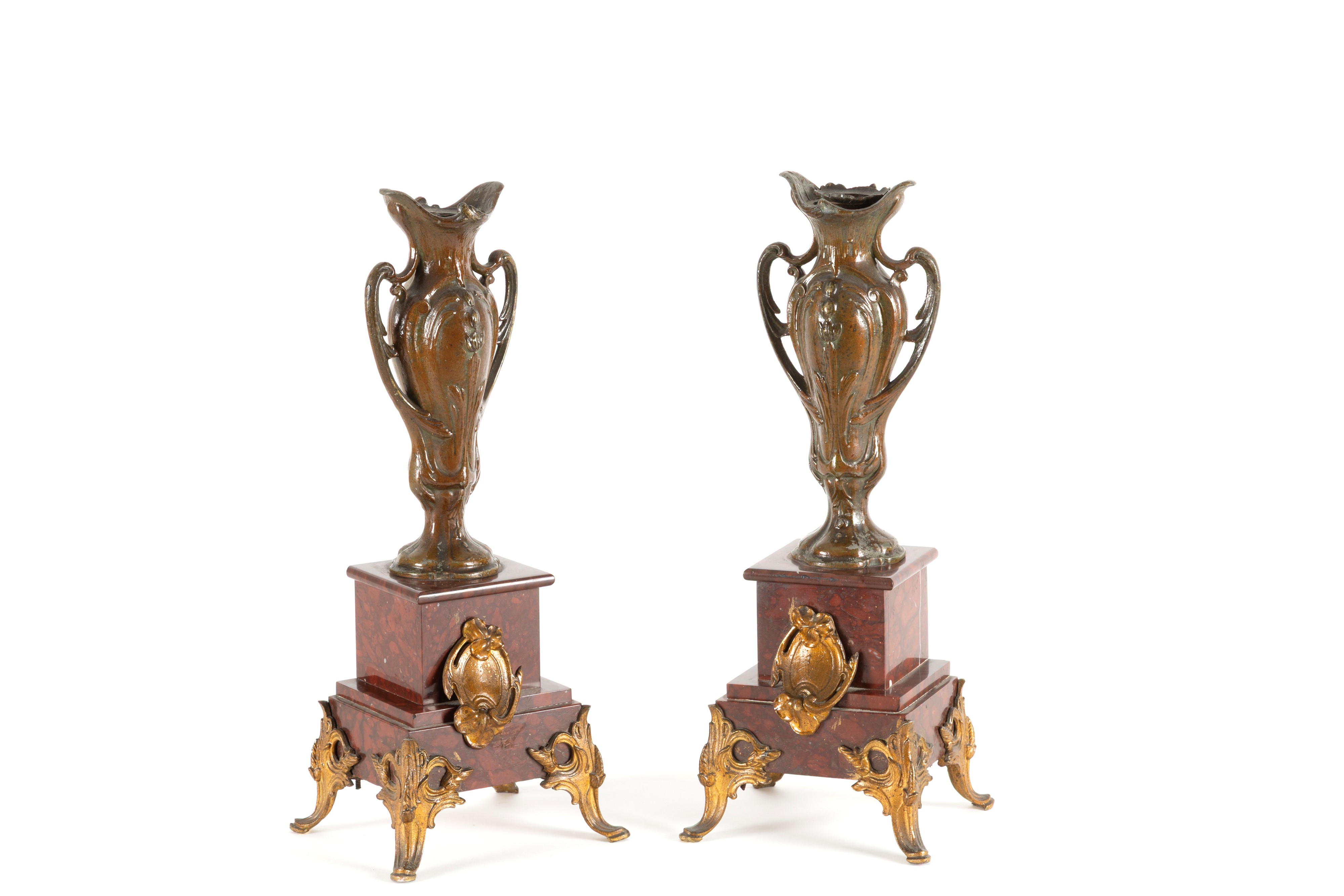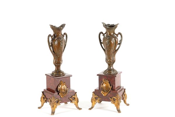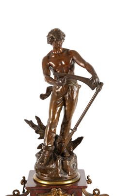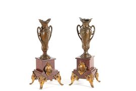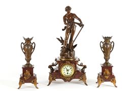 Trittico composto da un orologio e due candelieri in marmo rosso e antimonio. Francia. Fine XIX secolo.
