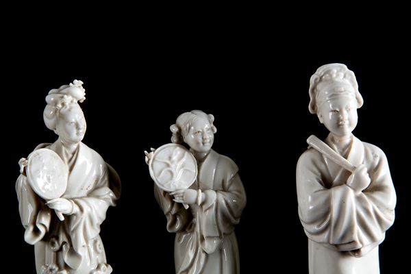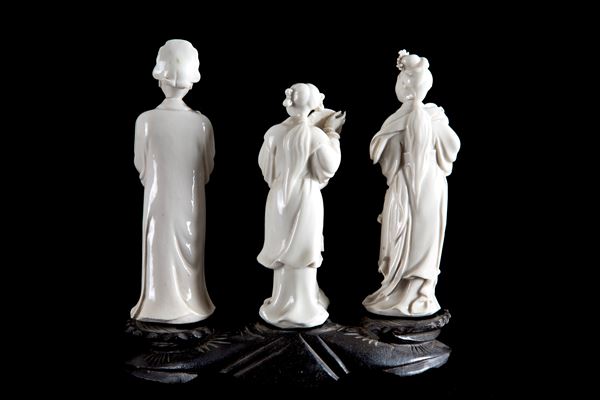 Trittico in porcellana bianca raffigurante “DIGNITARI”. Base in legno. Cina.