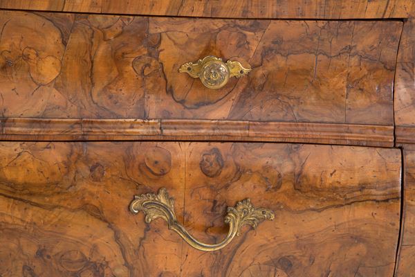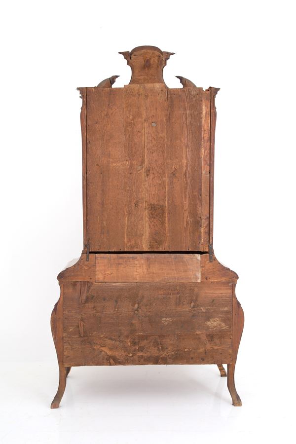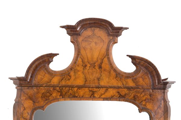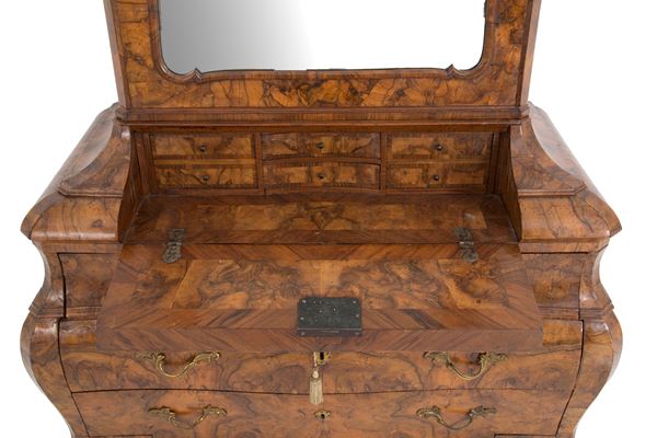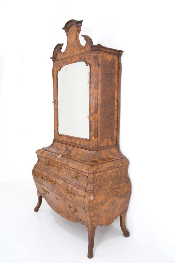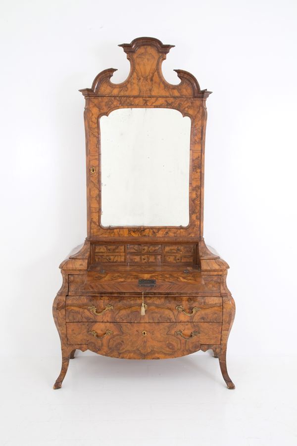 Trumeau lastronato in noce e radica di noce con parte inferiore bombata a tre cassetti e calatoia e parte superiore ad un'anta con specchio. Milano. XIX secolo.