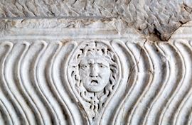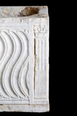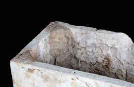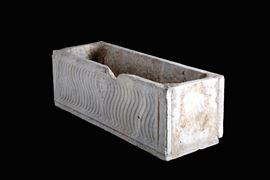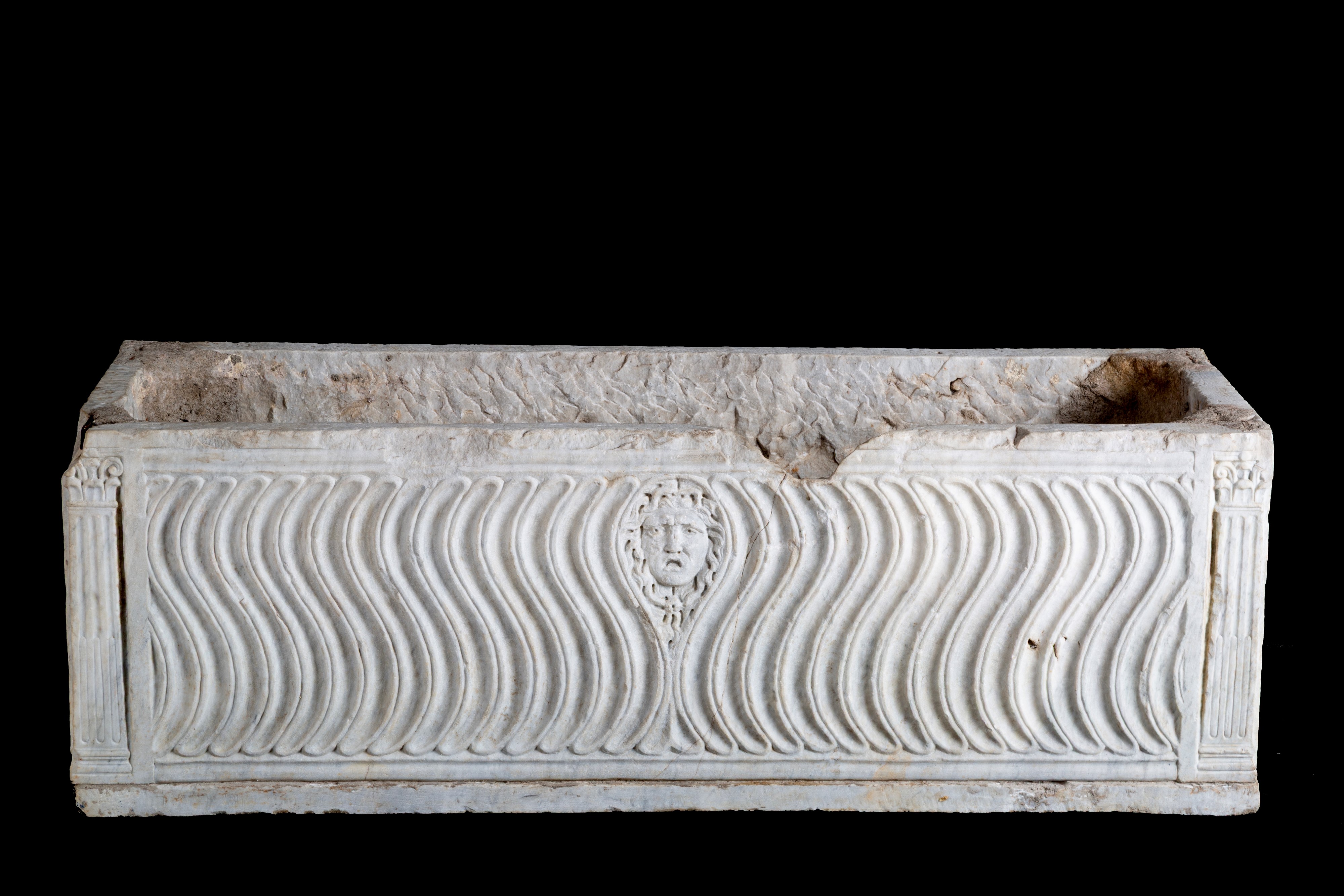 Vasca rettangolare in marmo decorata a onde sul fronte con mascherone al centro e due colonne ai lati. XVI secolo. Difetti e mancanze.