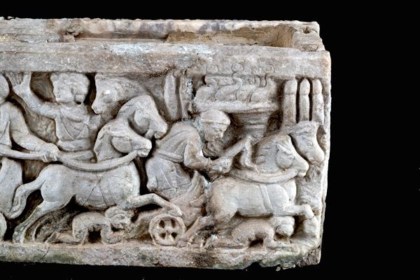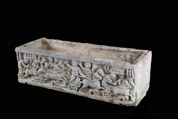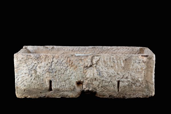 Antica vasca rettangolare in marmo istoriata sul fronte. Difetti, mancanze e sostituzioni.