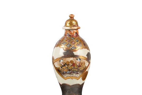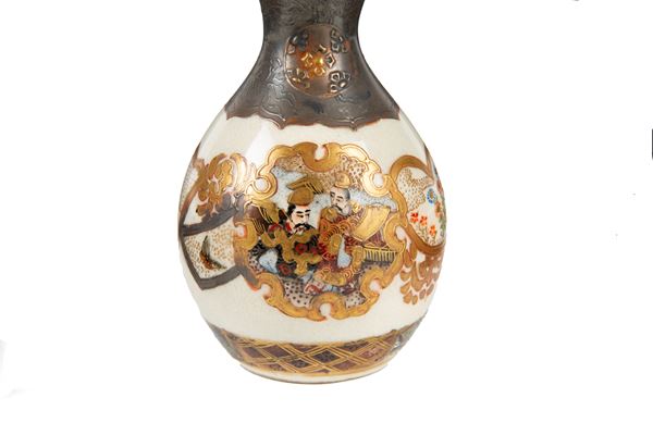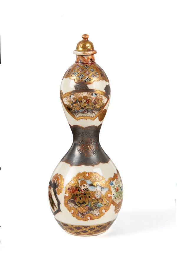 Vaso a zucca con coperchio in porcellana Satsuma decorata a scene di vita orientale. Marcato sul fondo. Giappone.