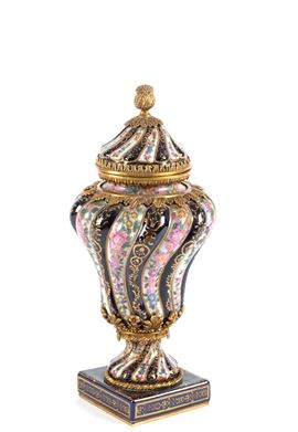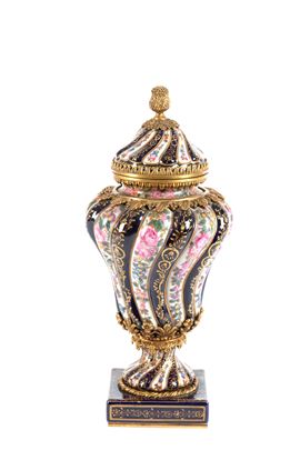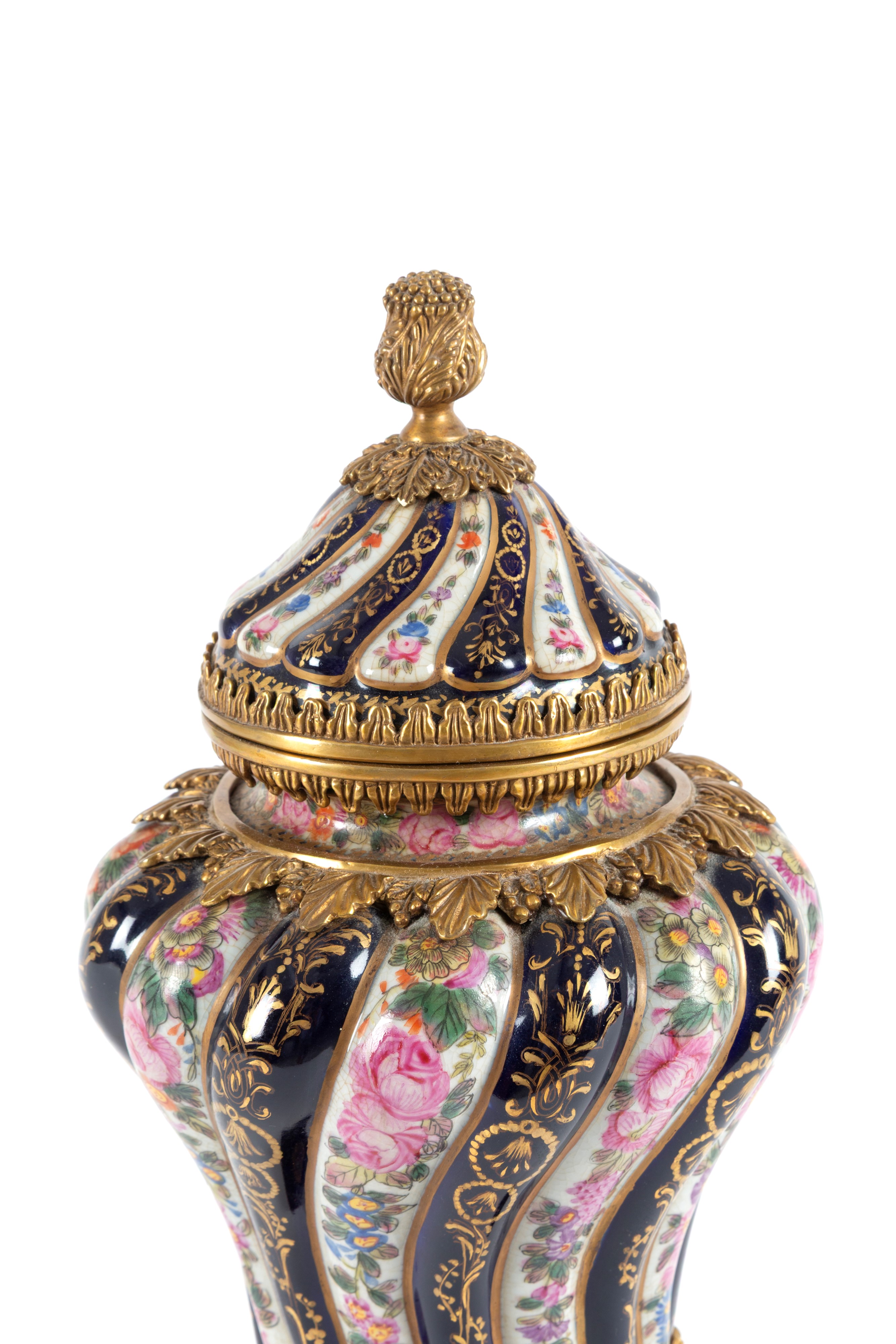 Vaso a torchon con coperchio in porcellana bianca e blu con motivi floreali e guarnizioni in bronzo cesellato. Francia. Fine XVIII secolo.