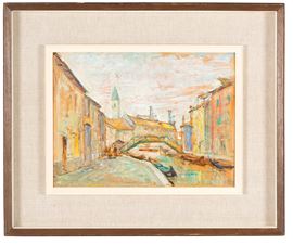 Dipinto olio su tavoletta raffigurante "BURANO". Firmato e datato '64 in basso a destra. In cornice.