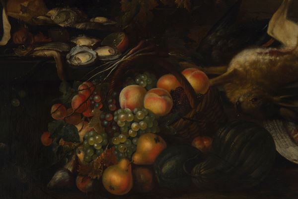Dipinto olio su tela raffigurante "NATURA MORTA". In cornice finemente intagliata e dorata. Già rintelato e rintelaiato. Restauri. Con lettera di attribuzione del Dott. Prof. Massimo Pirondini.