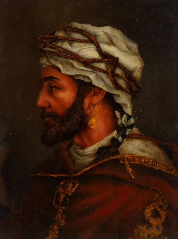 Dipinto olio su tavola raffigurante "RITRATTO ARABO". Firmato in basso a sinistra. In cornice.