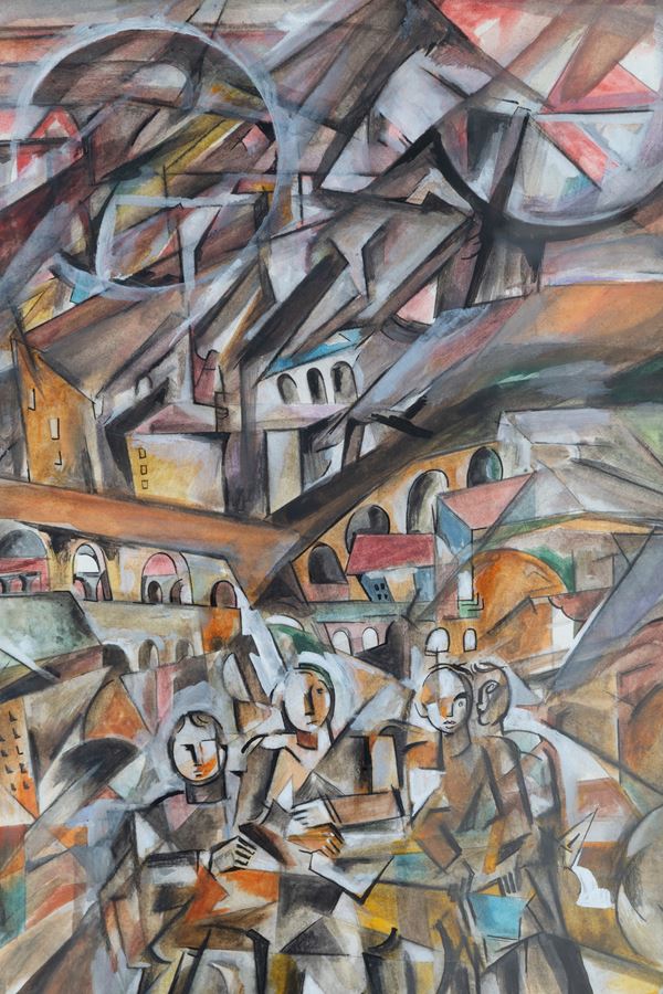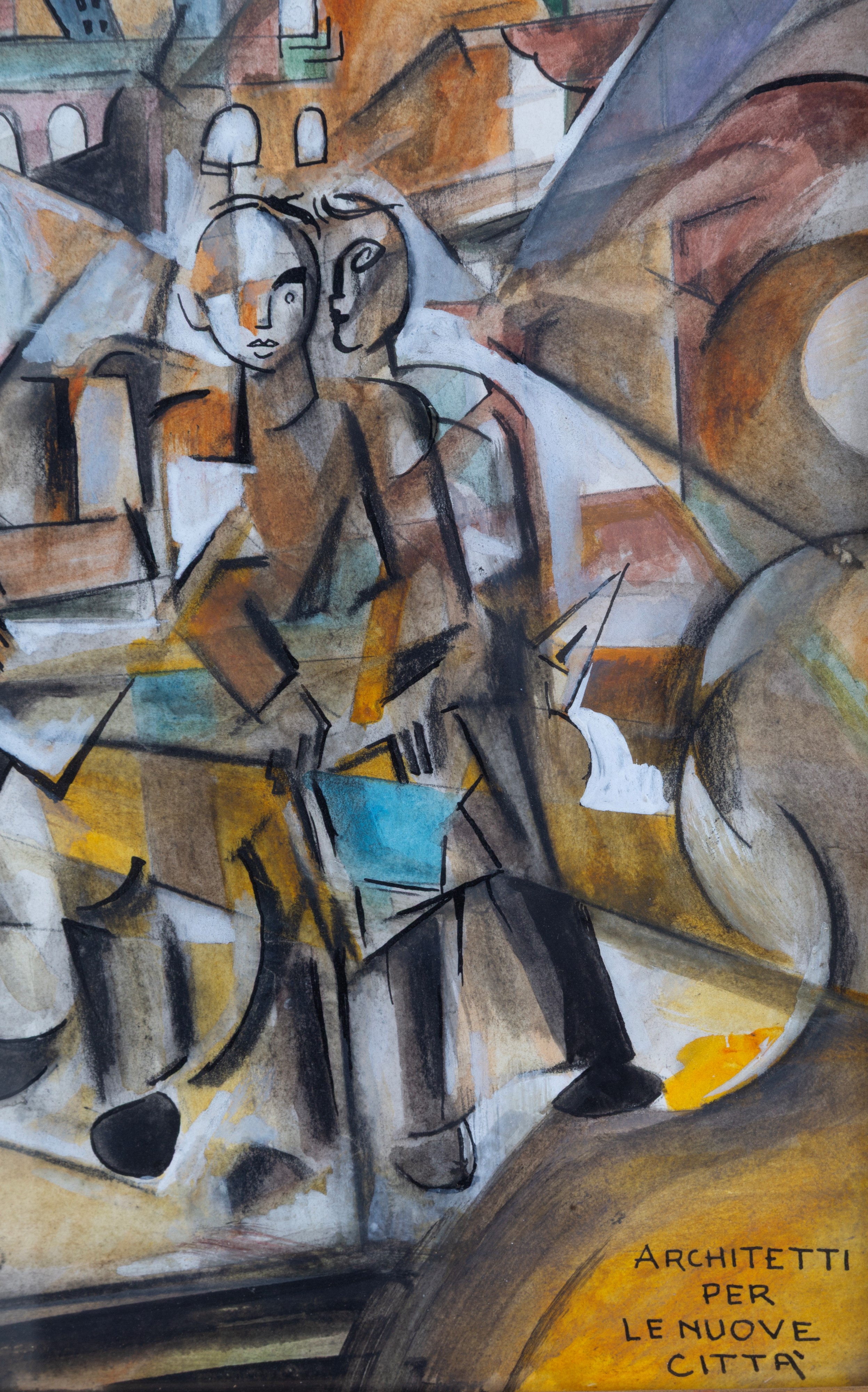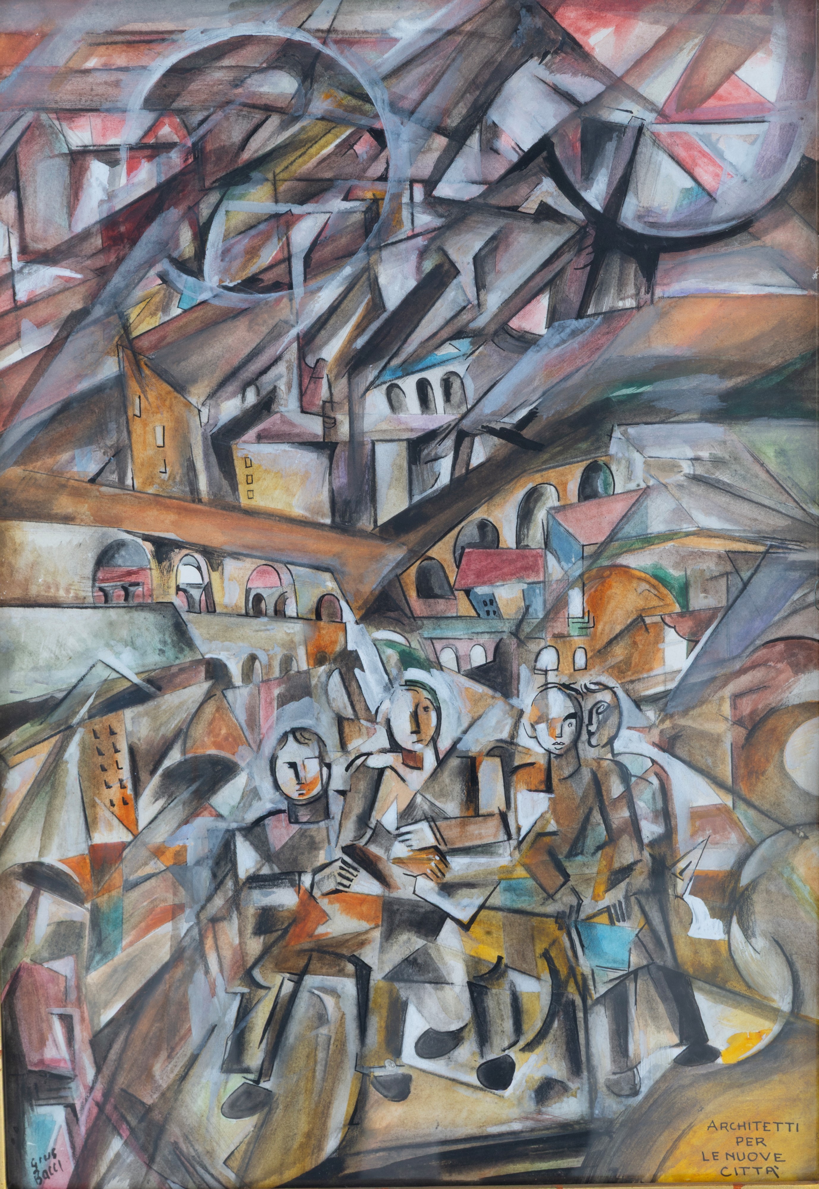 Dipinto acquarello e tempera su cartoncino intitolato "ARCHITETTI PER LE NUOVE CITTA'" in basso a destra. Firmato in basso a sinistra. In cornice.