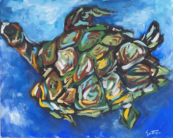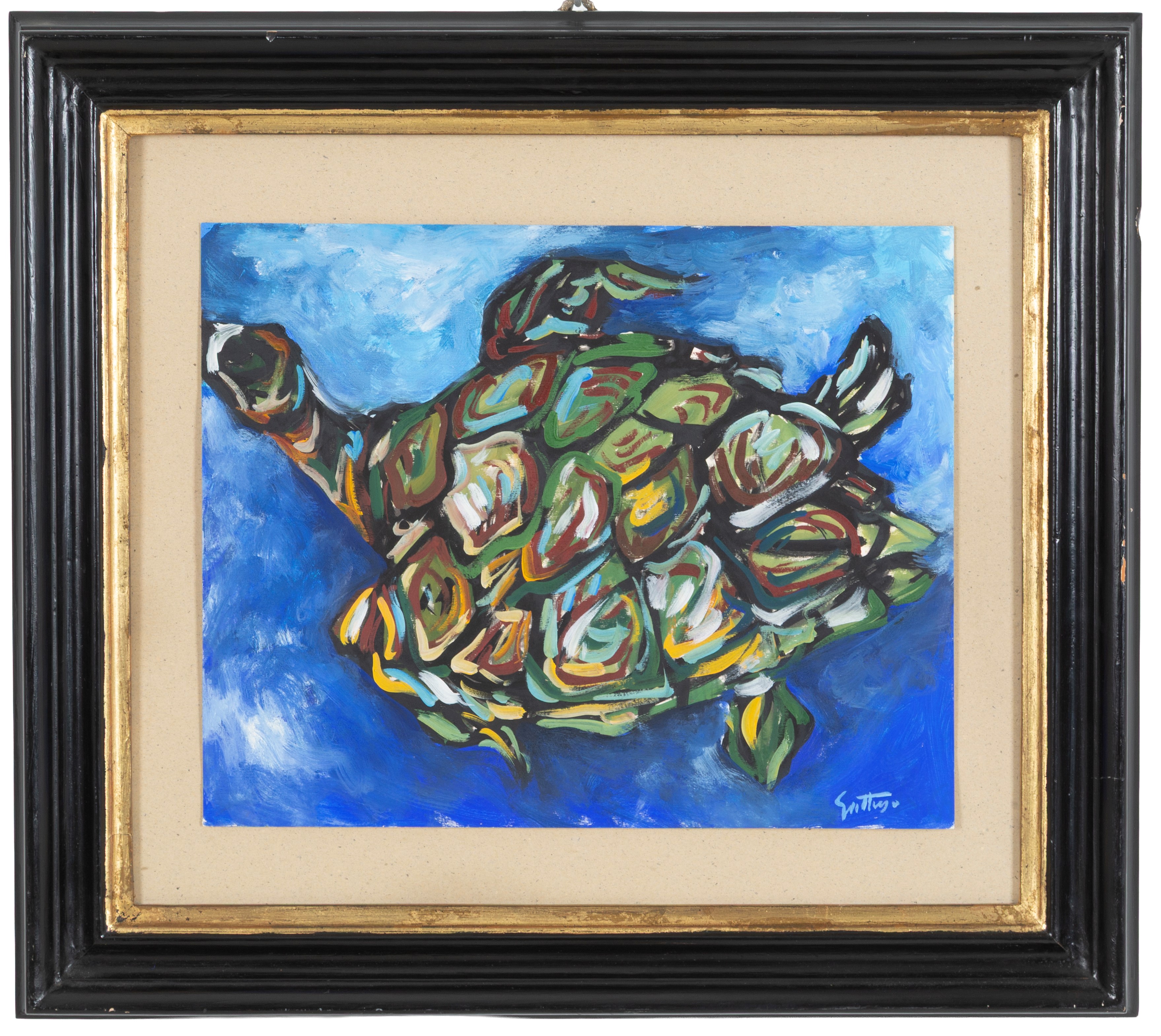 Acrilico su carta raffigurante "TARTARUGA". Firmato in basso a destra. In cornice.