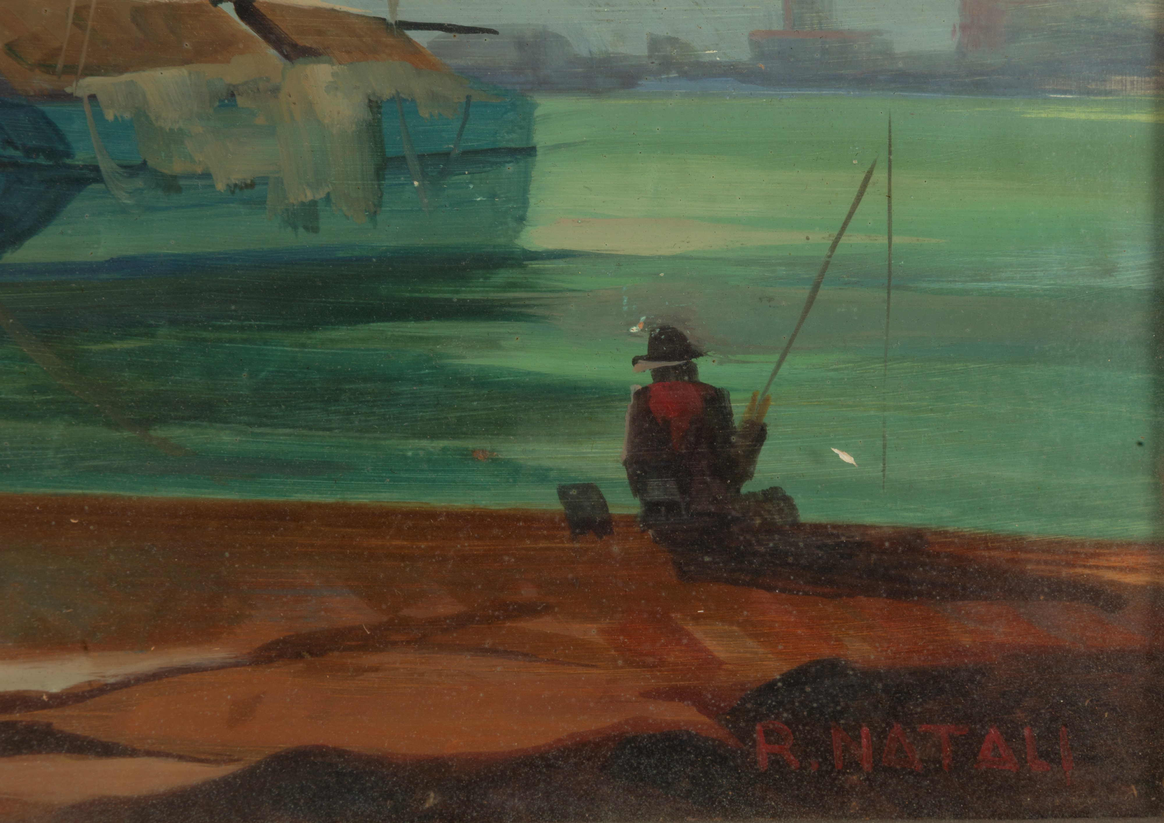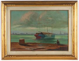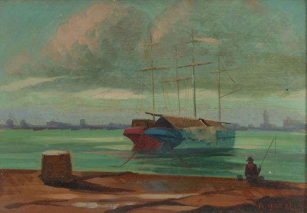 Dipinto olio su masonite raffigurante "VELIERI ORMEGGIATI CON PESCATORE". Firmato in basso a destra. Controfirmato sul retro. In cornice.